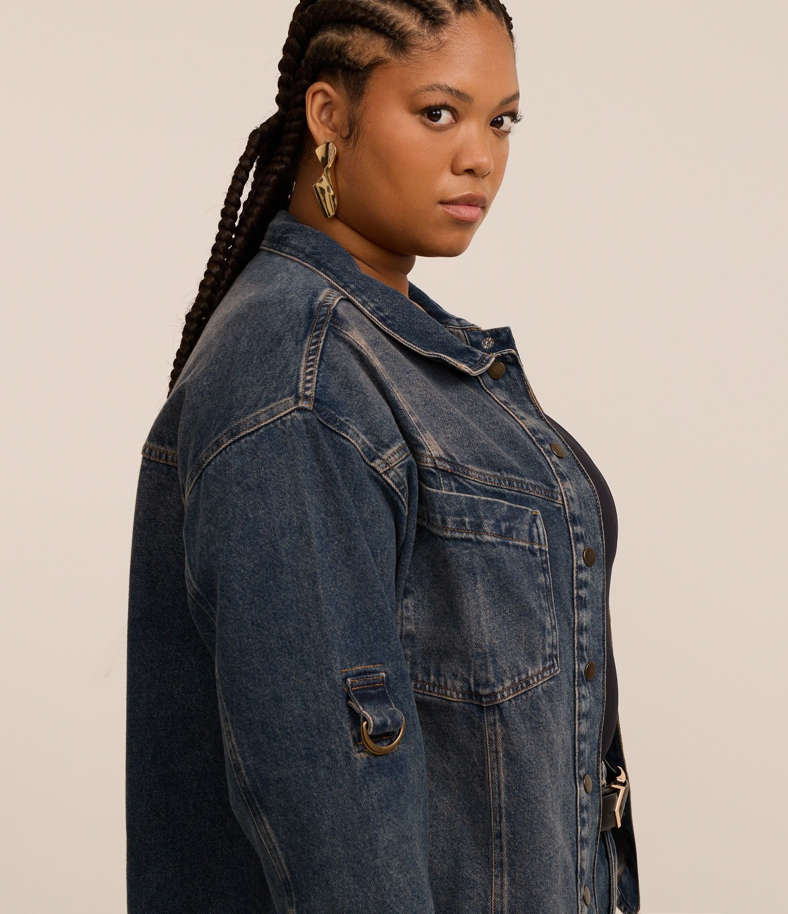 Camicia in denim blu con lavaggio sporco e spalline, taglie forti e curve, con tasca