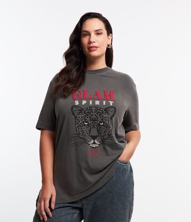 Maglietta in cotone esteso con stampa leopardo glamour, Spirit Curve e taglie forti, grigio slavato