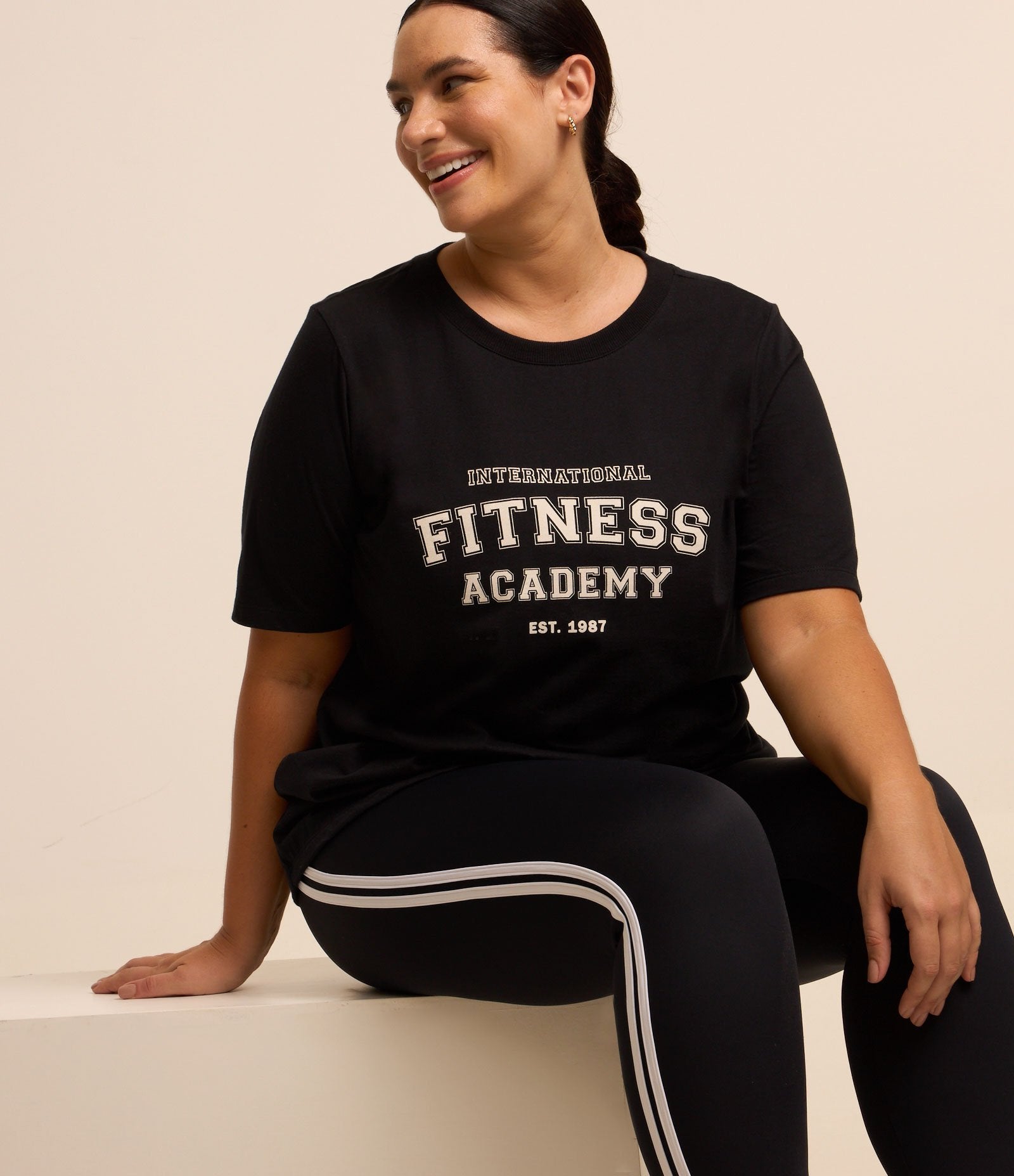 Maglietta sportiva oversize in cotone con stampa Fitness Academy, taglie forti e taglie forti, nero