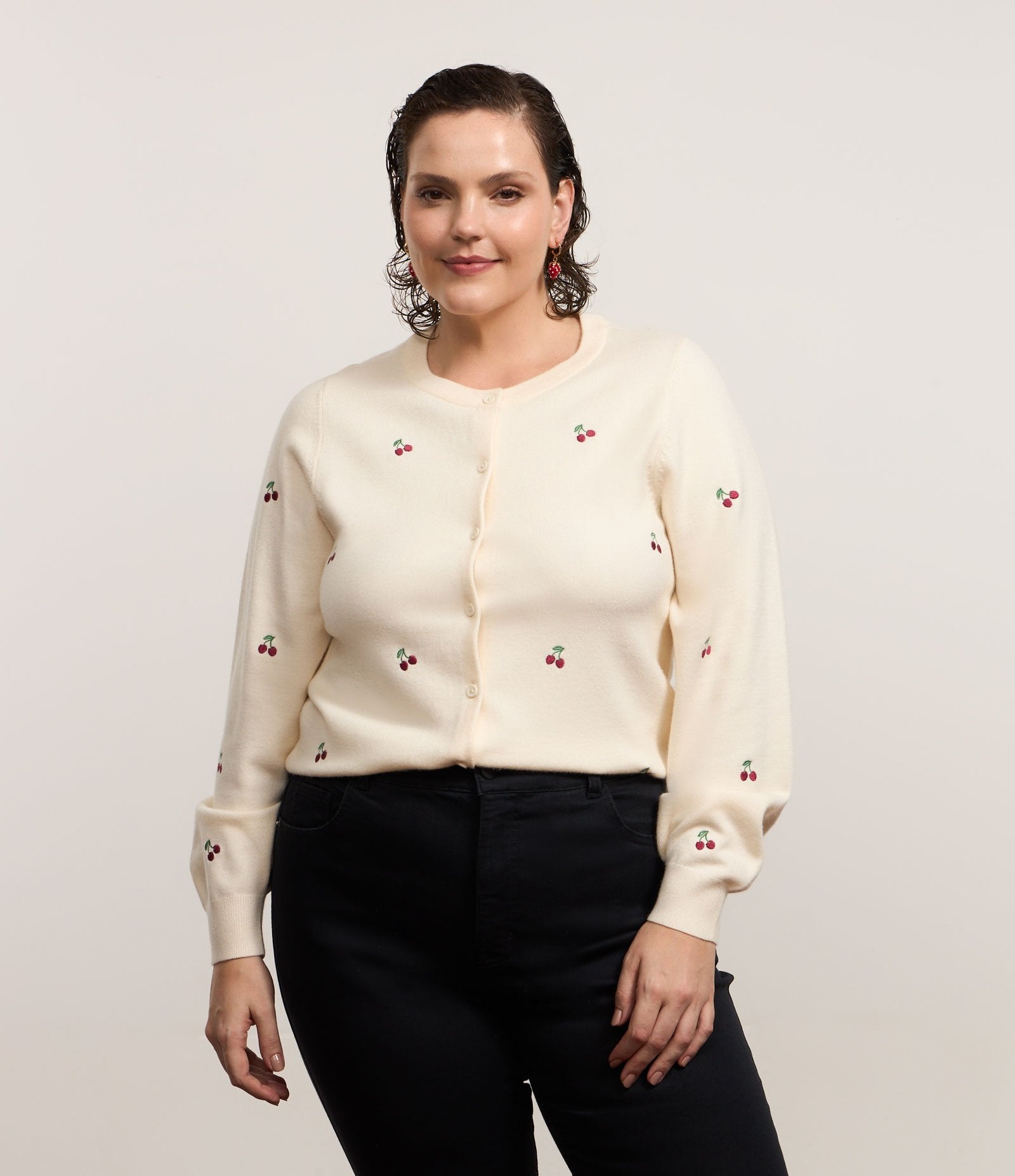 Cardigan in maglia color crema con ciliegie ricamate - Curve e taglie forti
