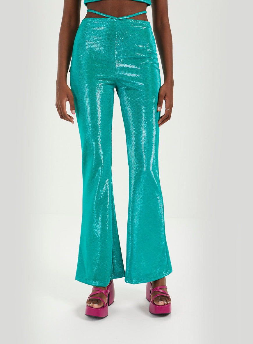 Pantaloni a vita bassa in piscina metallizzata. Realizzati per garantire comfort e stile, questi pantaloni sono caratterizzati da materiali di alta qualità e da un design contemporaneo. Ideali per le uscite casual e per l'eleganza di tutti i giorni.