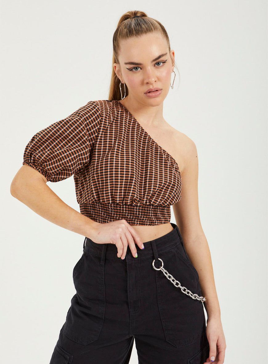 Camicetta a quadri con scollo asimmetrico. Realizzata per garantire il massimo comfort con materiali di alta qualità e un tocco moderno. Ideale per un abbigliamento casual e quotidiano.
