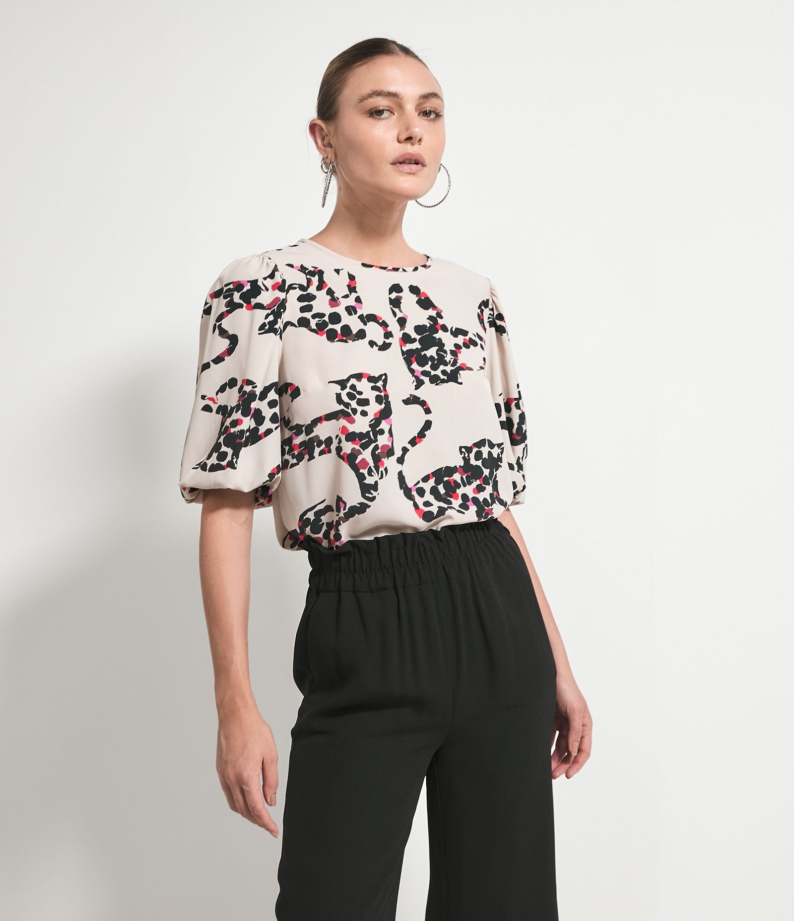 Camicetta a maniche corte a palloncino con stampa animalier rosa