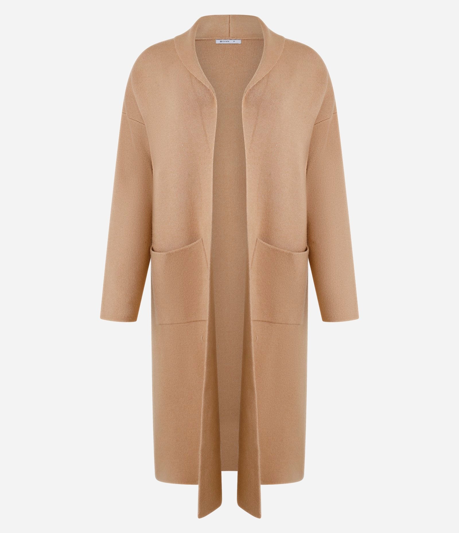 Cardigan lungo in maglia con spalle scese e tasche beige