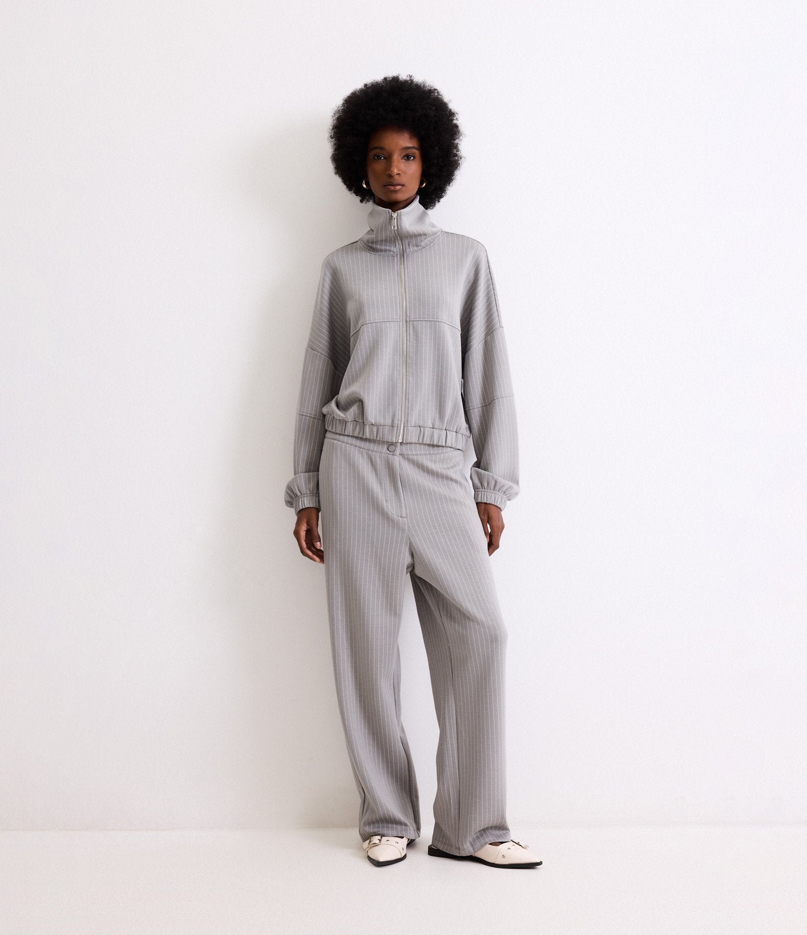 Giacca bomber grigia in tessuto a maglia con strisce e collo a bavero