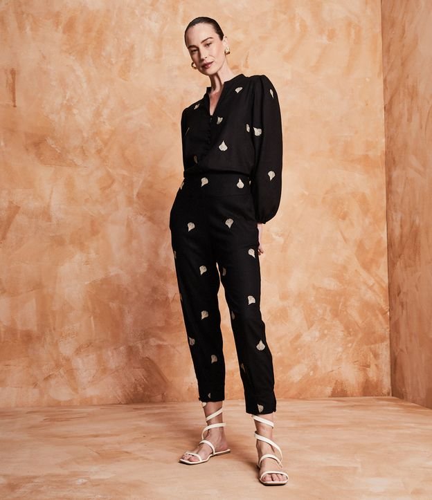 Pantaloni Aladdin in lino con ricamo a foglie nere