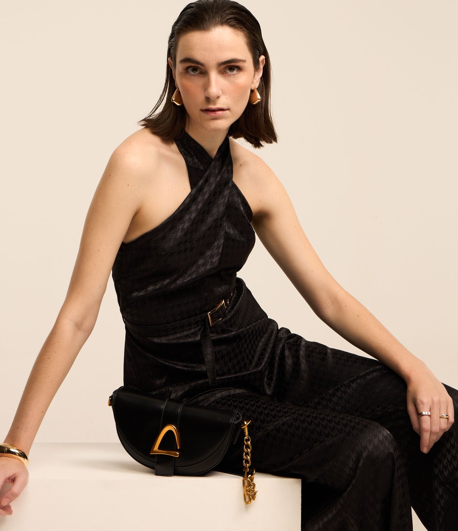 Tuta sartoriale con collo a farfalla e stampa pied-de-poule grigio scuro