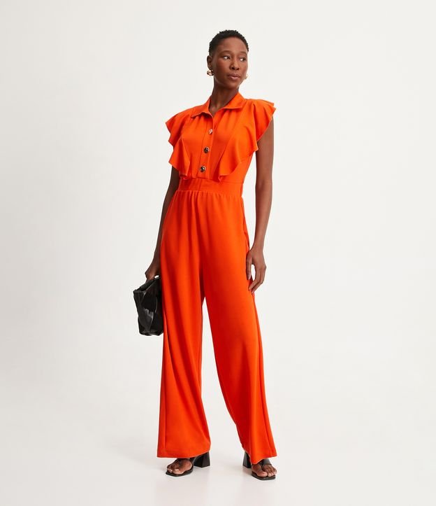 Tuta senza maniche in piqué con bottoni frontali e volant arancioni