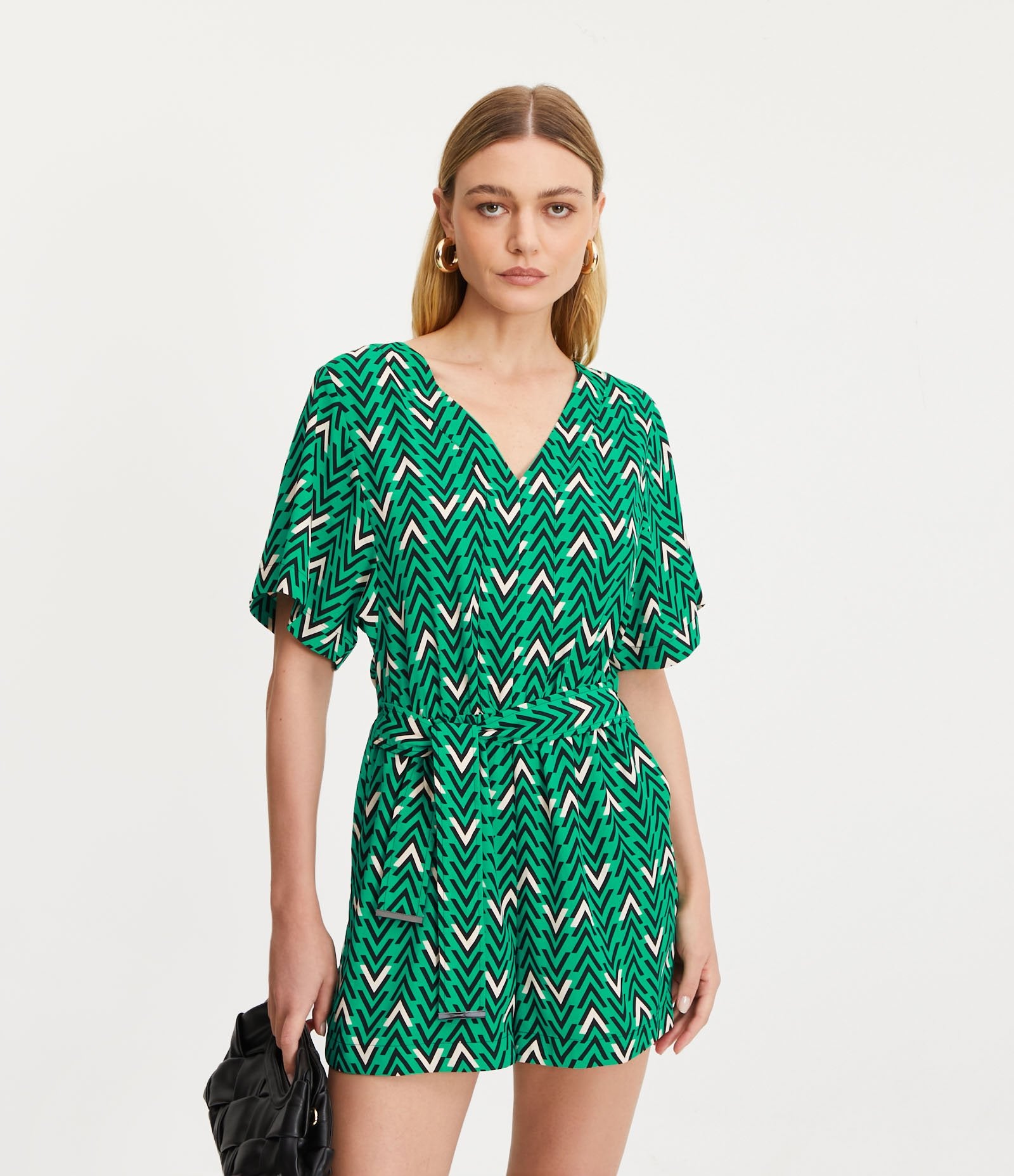 Pagliaccetto verde con stampa geometrica e cintura a fascia di Cortelle - Prova il perfetto mix di comfort, qualità e stile in ogni capo.