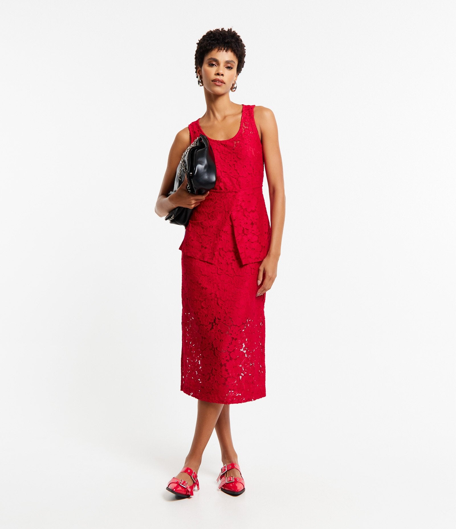 Abito in pizzo guipure rosso con volant a strati di Cortelle - Prova la miscela perfetta di comfort, qualità e stile in ogni capo.