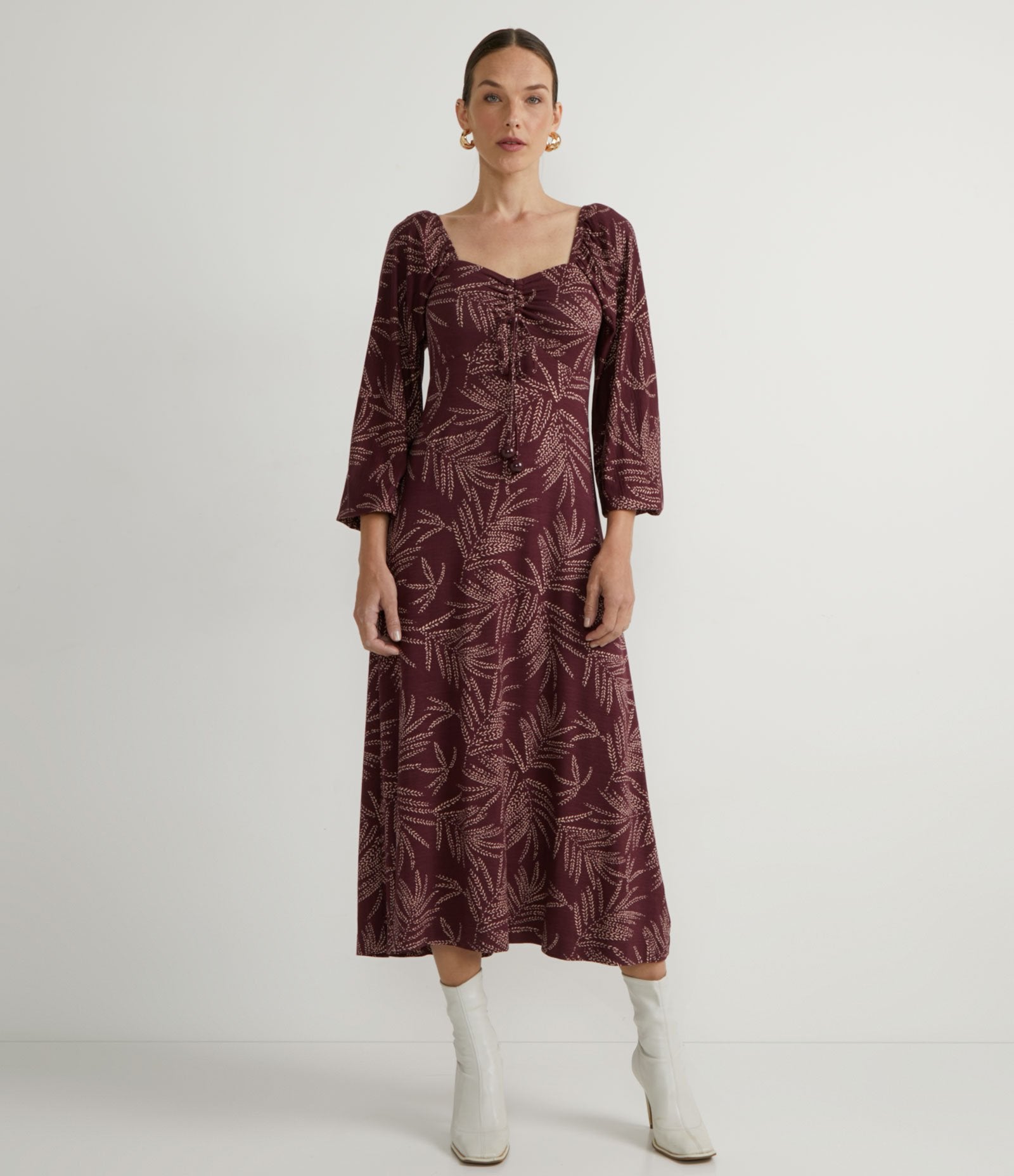 Abito lungo in Viscolycra con stampa a foglie e scollo a cuore viola