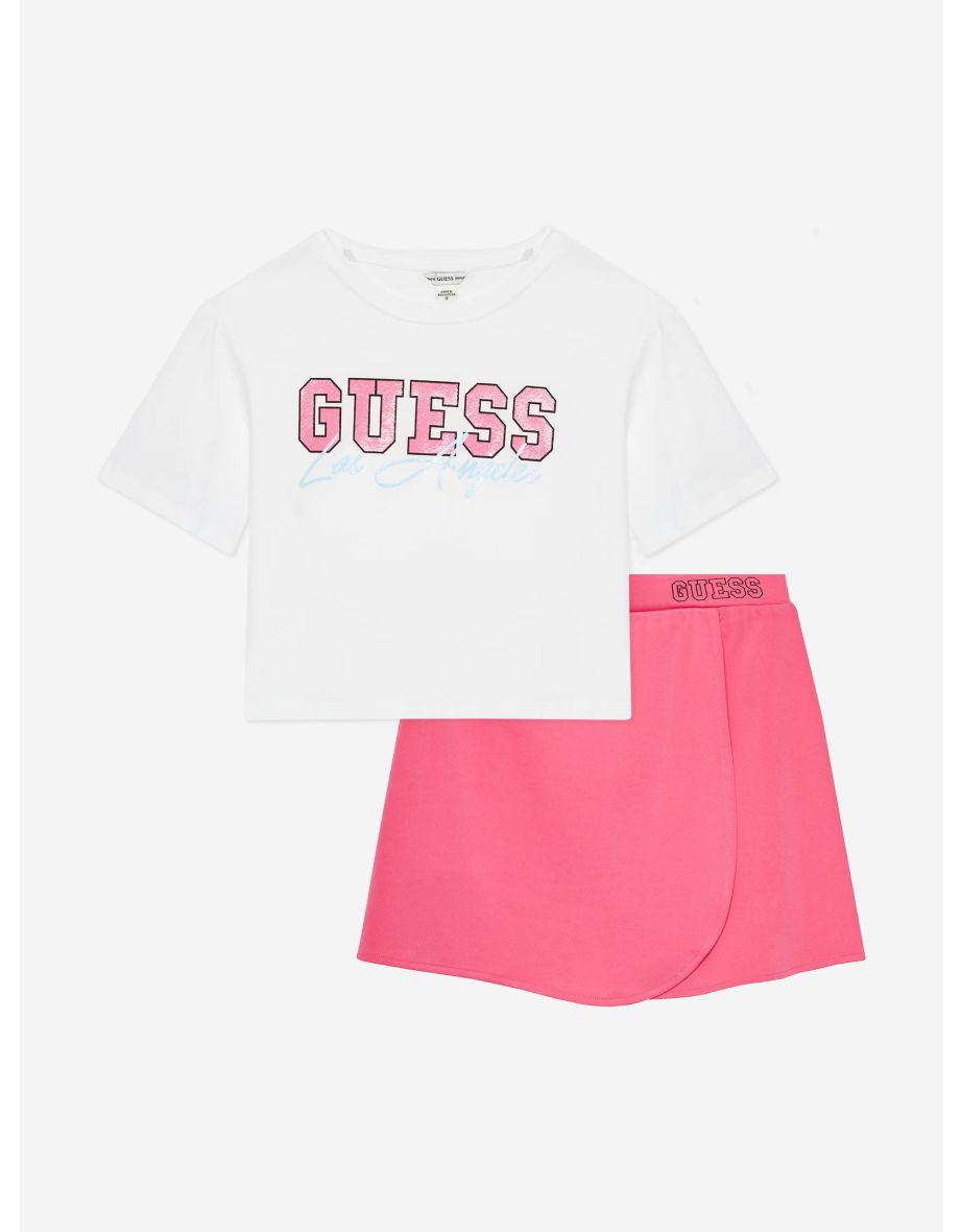 Il set di maglietta e gonna da ragazza in bianco di Guess è la scelta ideale per uno stile casual senza sforzo e da indossare tutti i giorni.