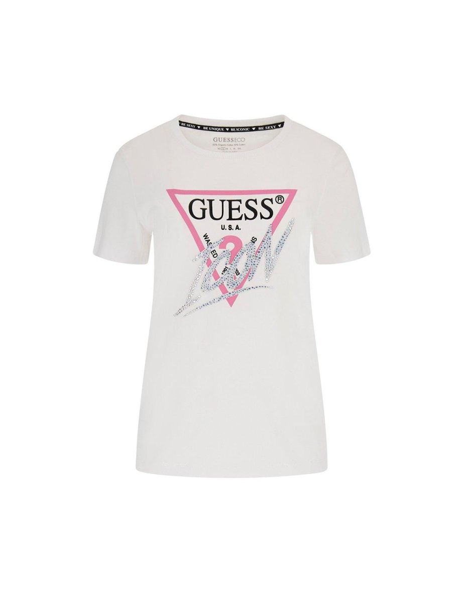 La Ss Crew Neck Icon Tee in bianco puro di Guess è la scelta ideale per uno stile casual senza sforzo e da indossare tutti i giorni.