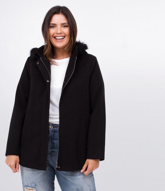 Giacca nera con cappuccio in pelliccia sintetica, taglie forti e taglie forti