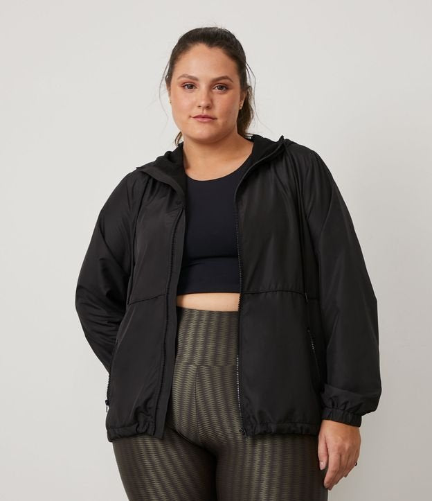 Giacca a vento con cappuccio e chiusura a zip, taglie forti e taglie forti, nero