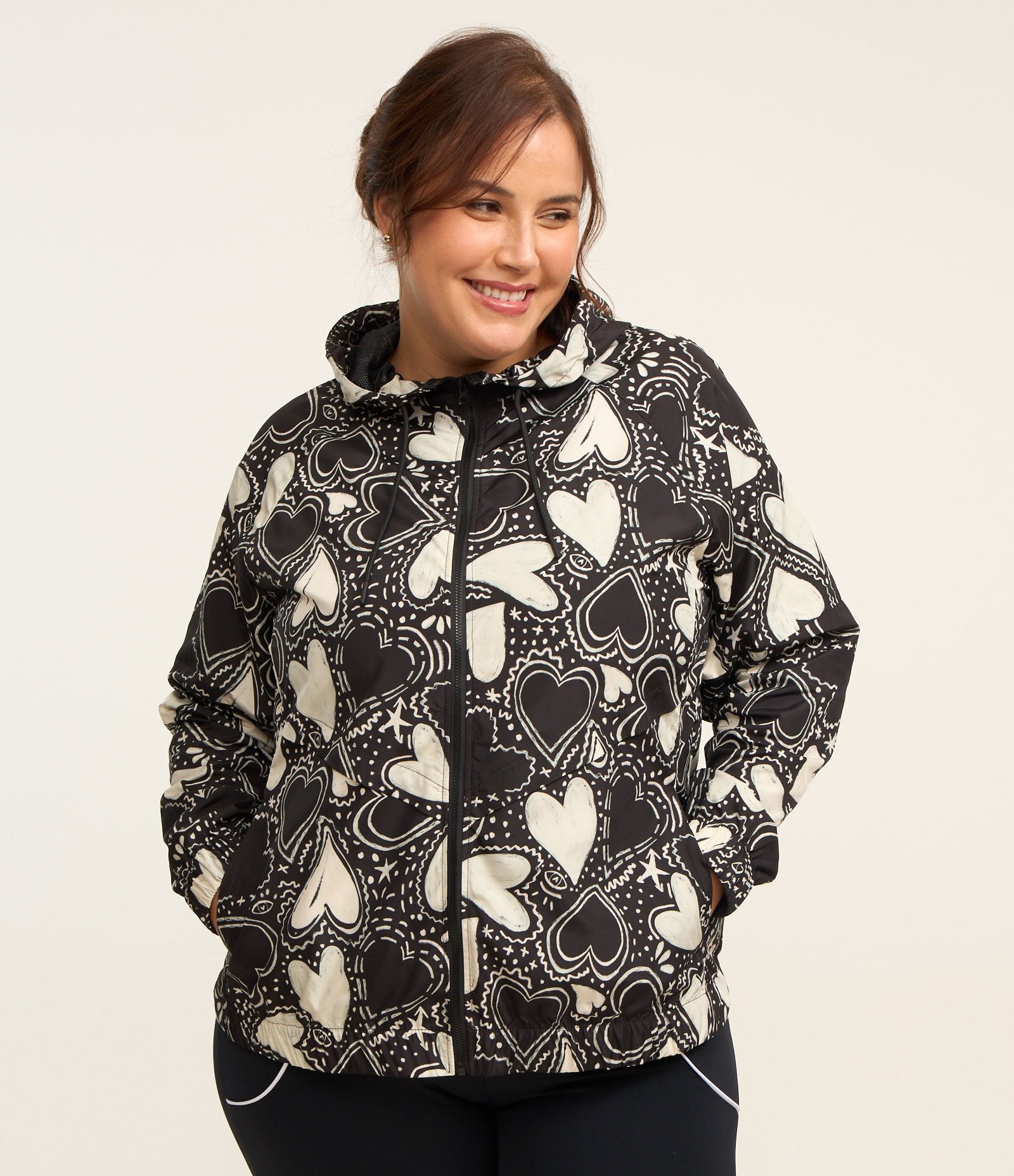 Giacca a vento stampata con cappuccio, taglie forti e taglie forti, nero