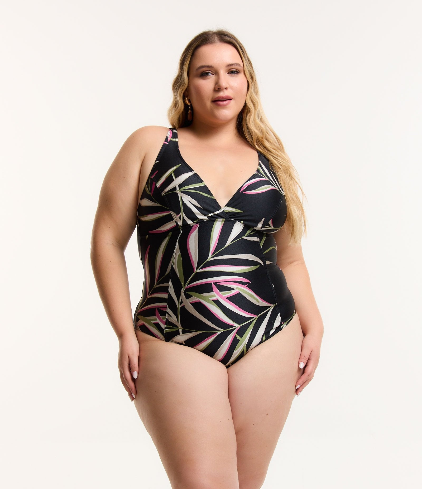 Costume da bagno in microfibra leggera con stampa foliage e coppe imbottite a triangolo - Curve e taglie forti nero