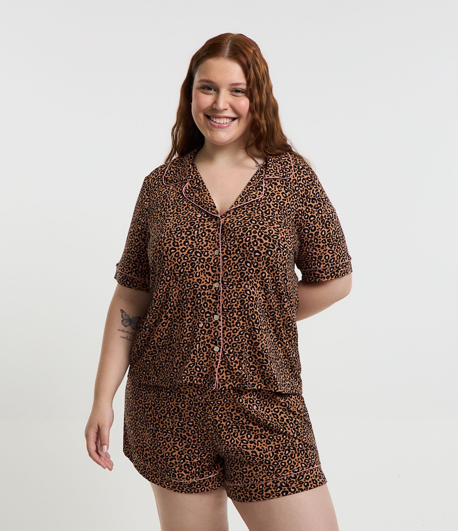 Pigiama americano in viscosa con stampa leopardo, taglie forti e taglie forti, marrone
