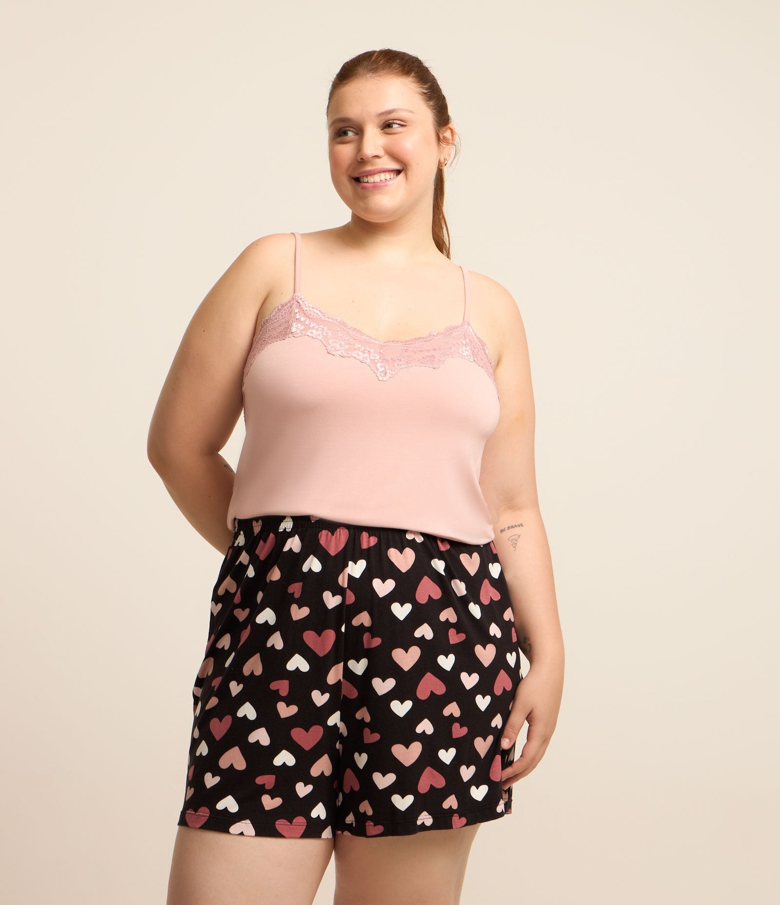 Pigiama corto in viscosa con stampa a cuore, taglie forti e taglie forti, nero/rosa