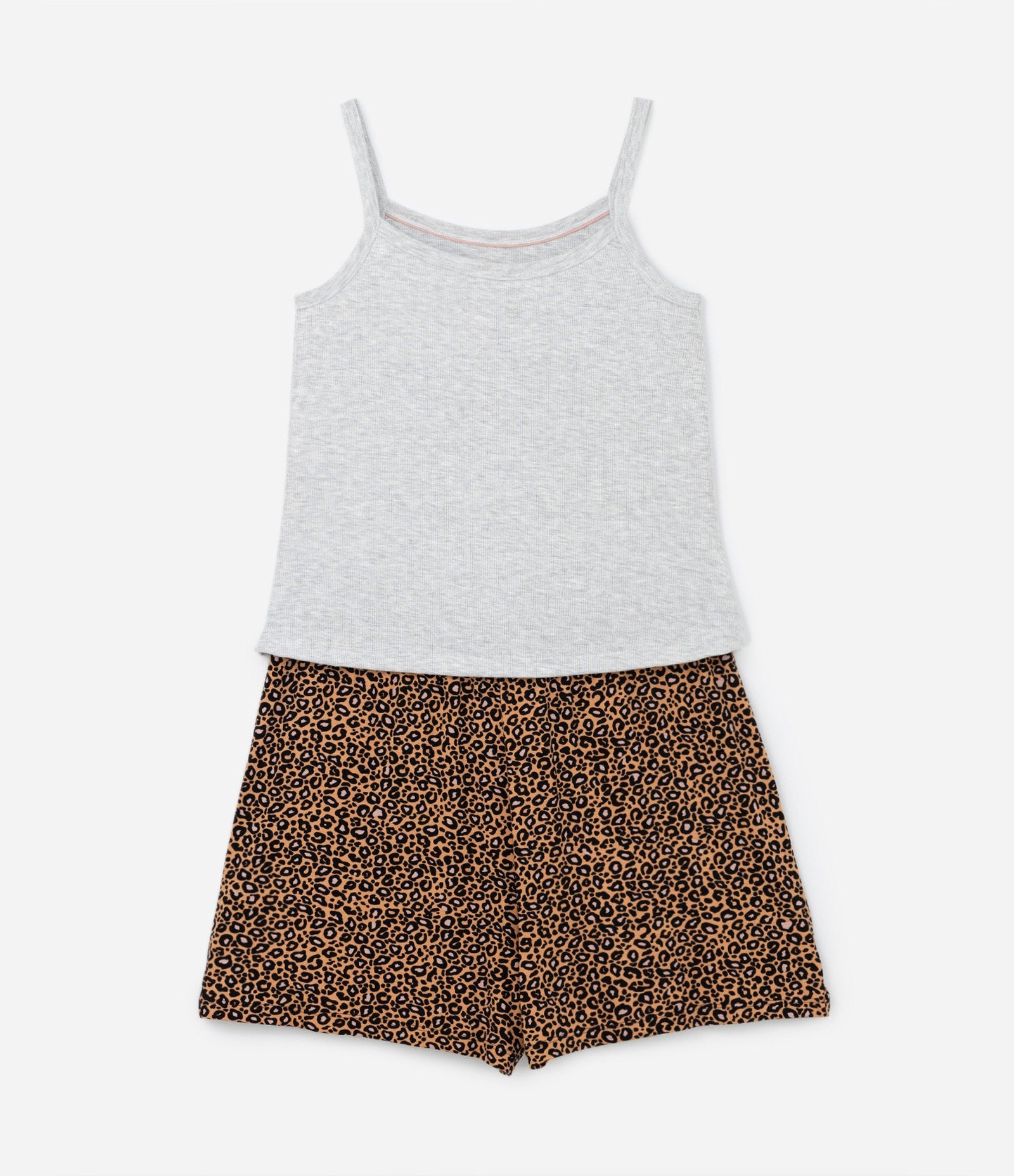 Pigiama corto in viscosa con stampa leopardata, taglie forti e taglie forti, grigio/marrone