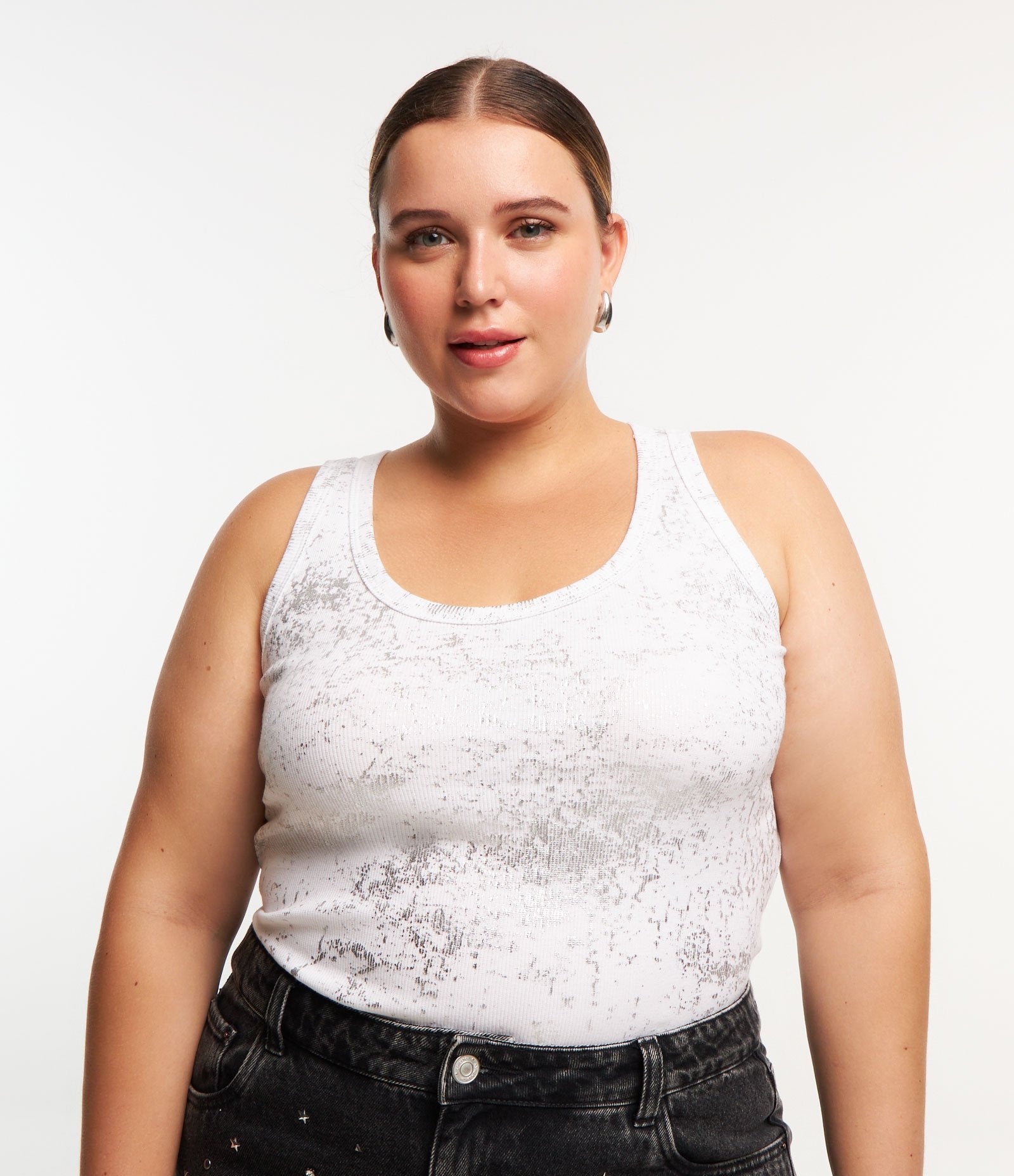 Canotta a coste con finitura in foil Curve e taglie forti Bianco/Argento