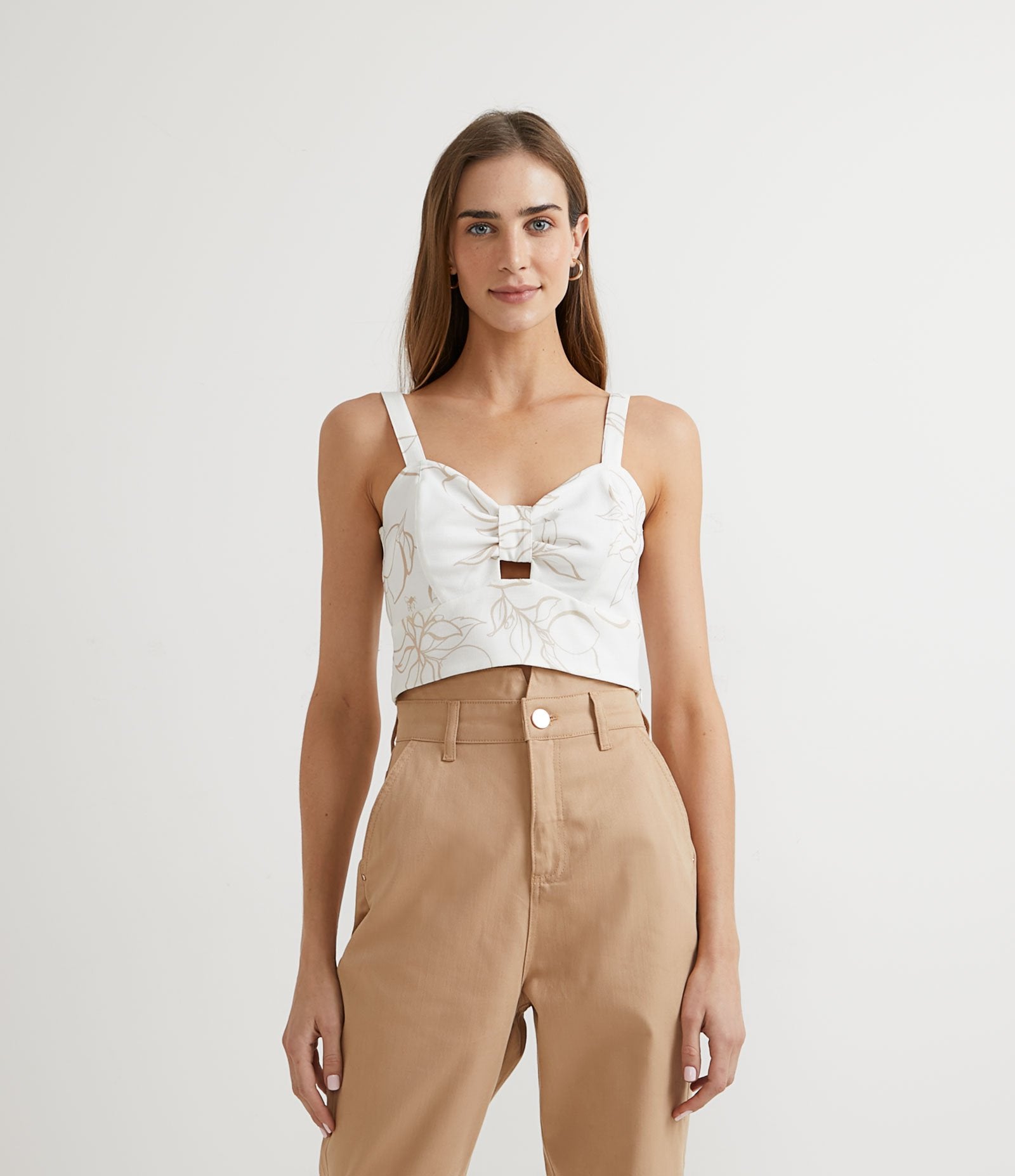 Camicetta cropped in poliestere con dettaglio sul busto e stampa di fogliame bianco