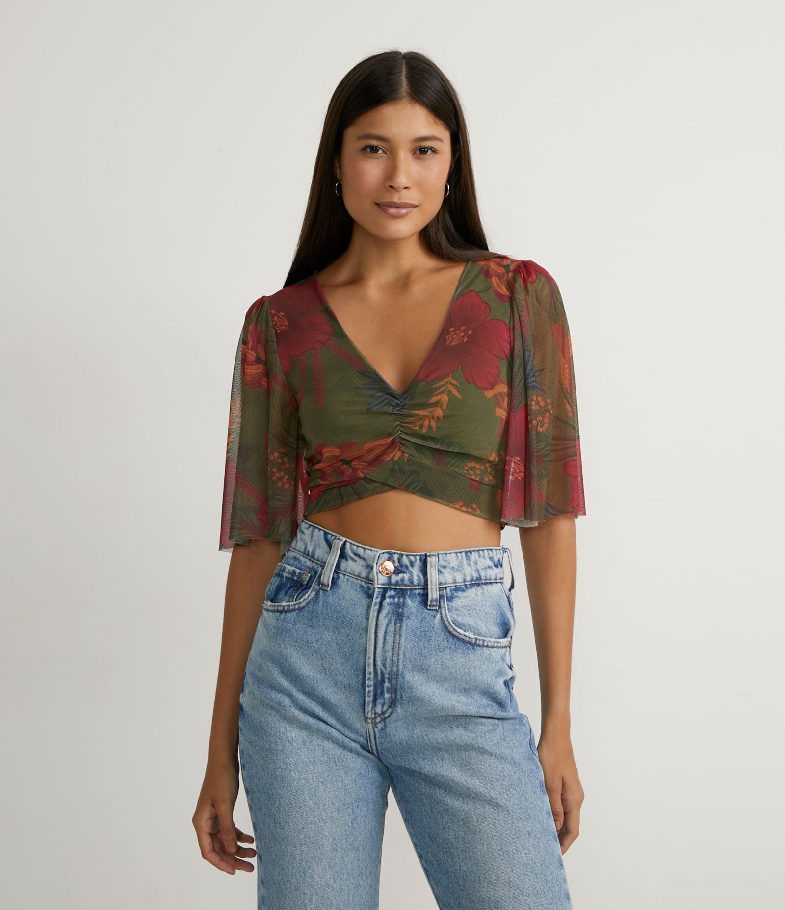 Camicetta cropped in tulle con stampa faunistica verde e maniche svasate