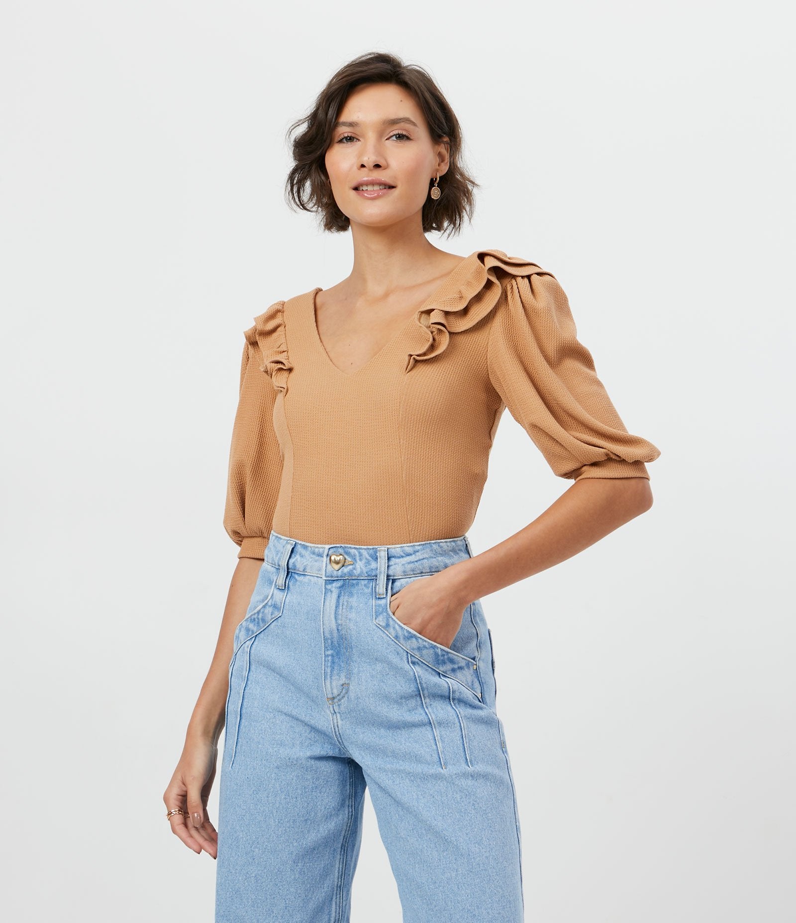 Camicetta arricciata con maniche a sbuffo e volant sulle spalle in beige