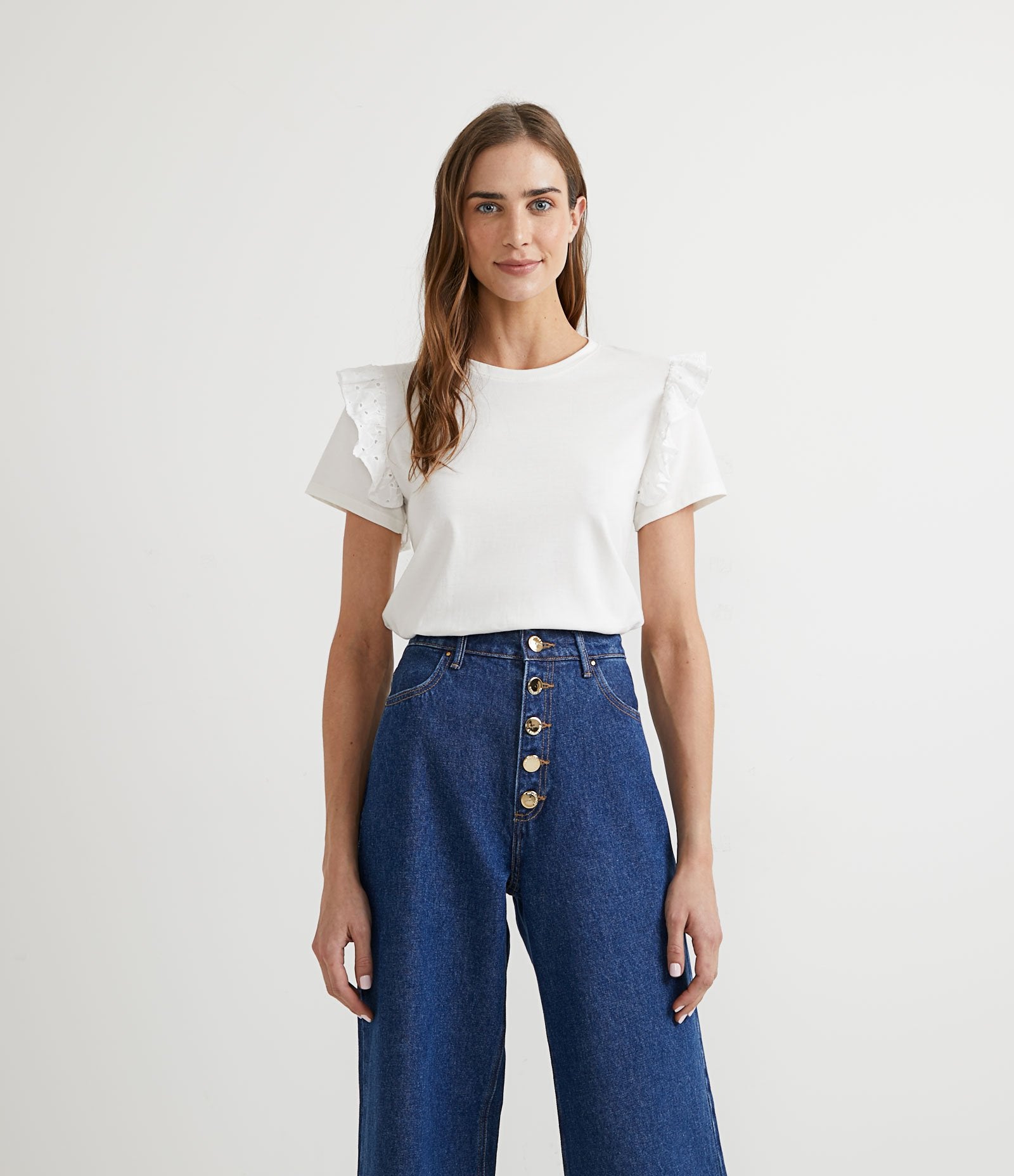 Camicetta in cotone a manica corta con volant bianco e occhiello