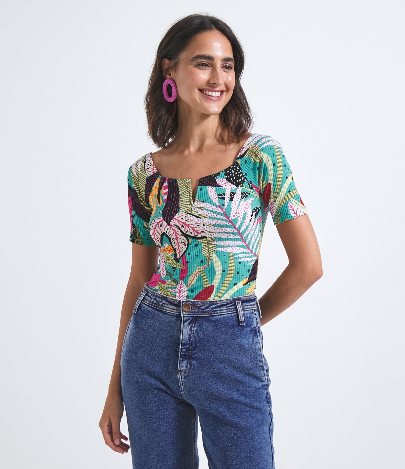 Camicetta stampata a maniche corte con scollo quadrato e dettaglio a V in verde