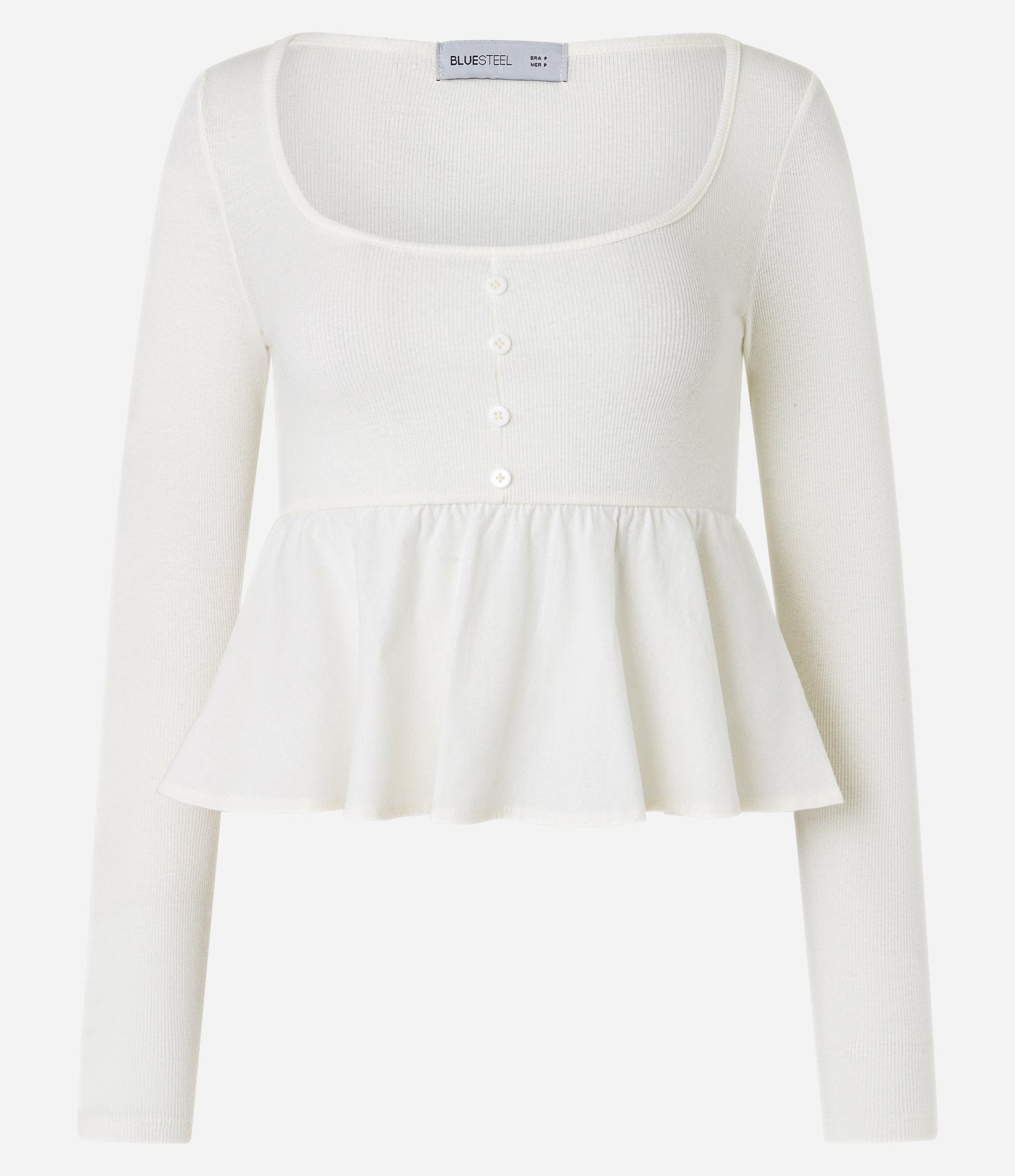 Camicetta con peplo in maglia a coste e tricolore con bottoni bianco sporco