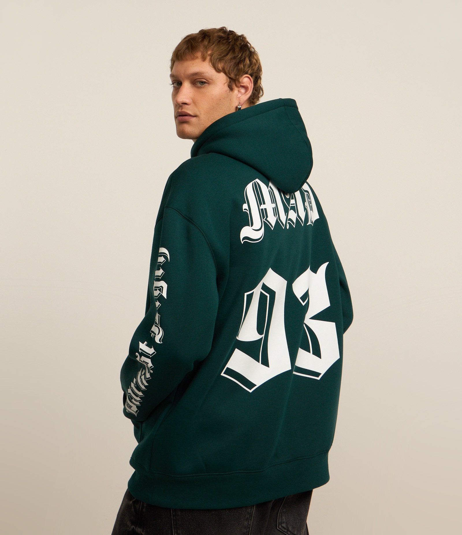 Felpa rilassata con cappuccio con stampa a croce e scritte in verde