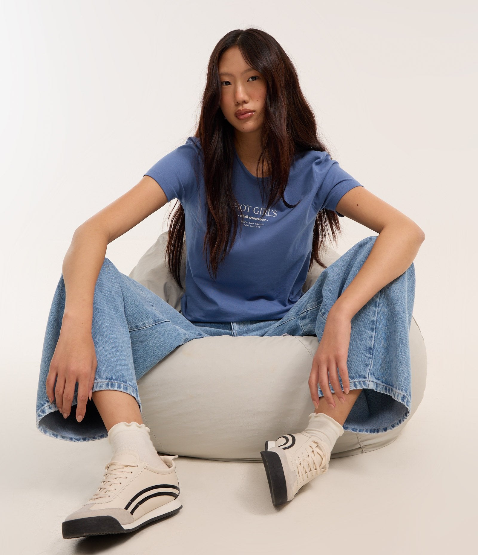 Maglietta Baby Look in cotone blu con stampa Hot Girls