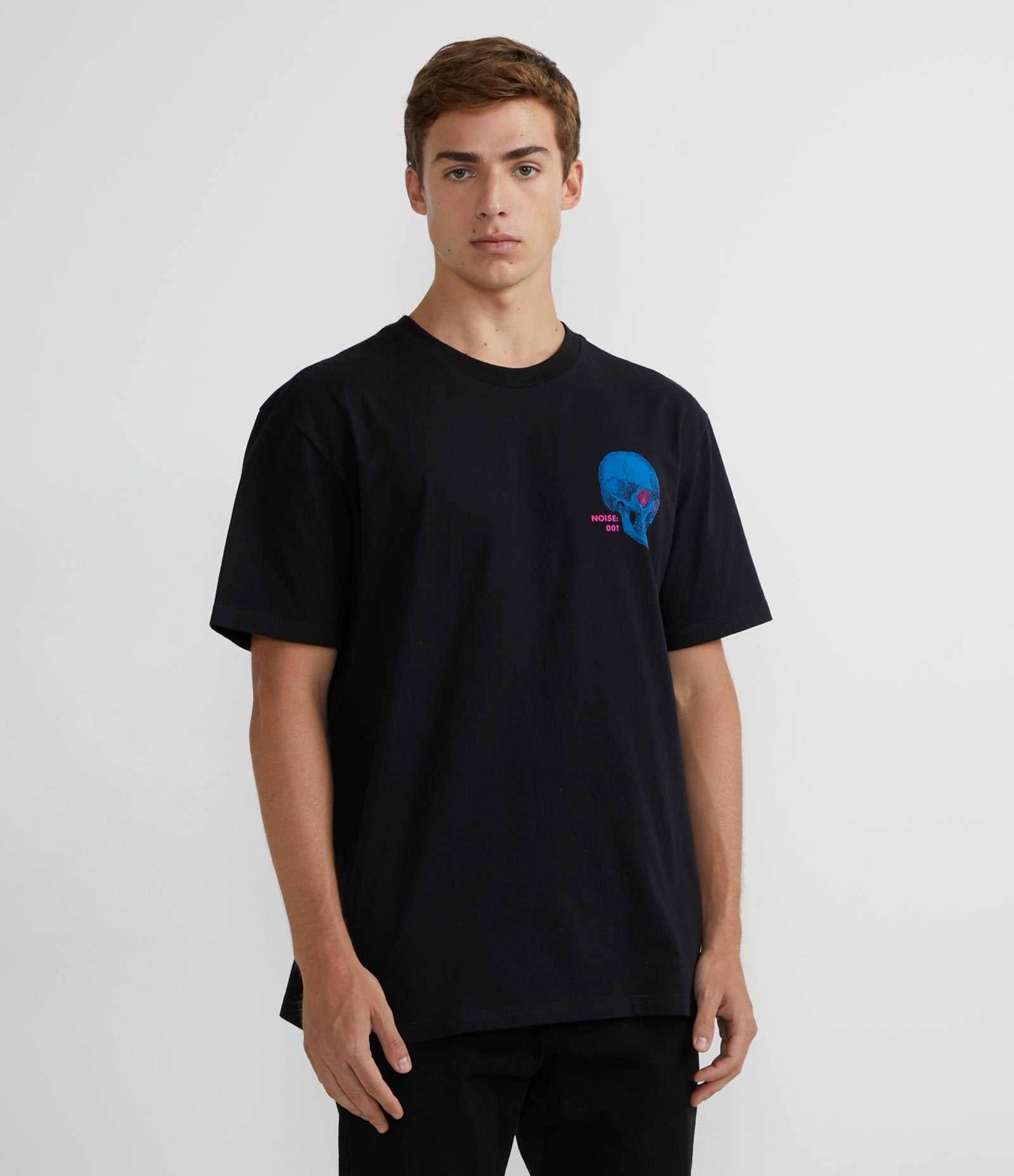 Maglietta a maniche corte in cotone grigio con stampa di teschi e scritta "Noise 01".
