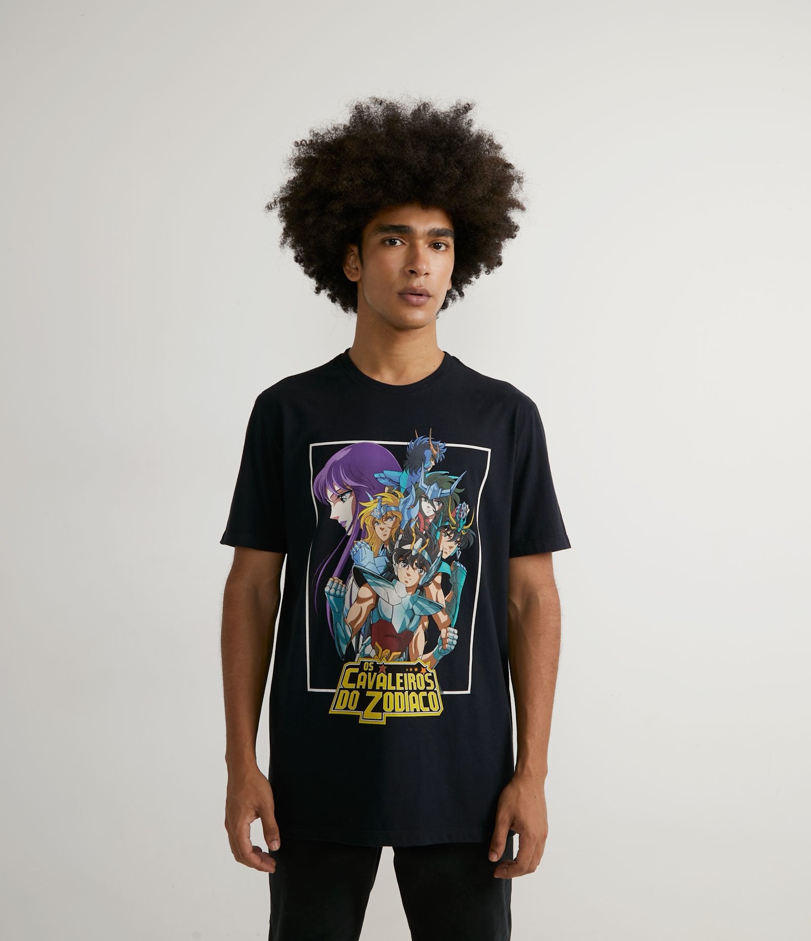 Maglietta nera a manica corta con stampa dei Cavalieri dello Zodiaco