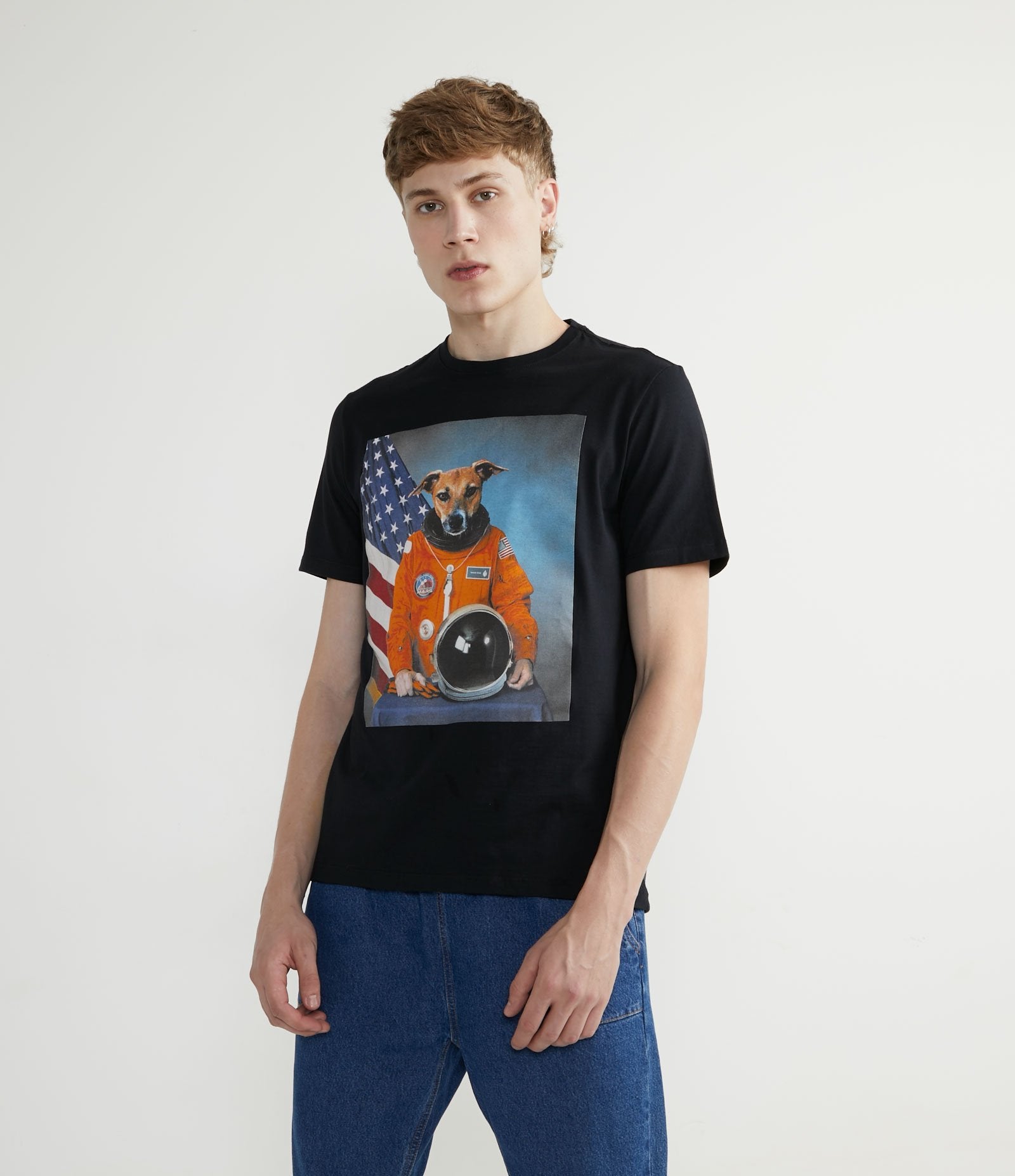 Maglietta a manica corta in cotone nero con stampa di cani astronauti color caramello