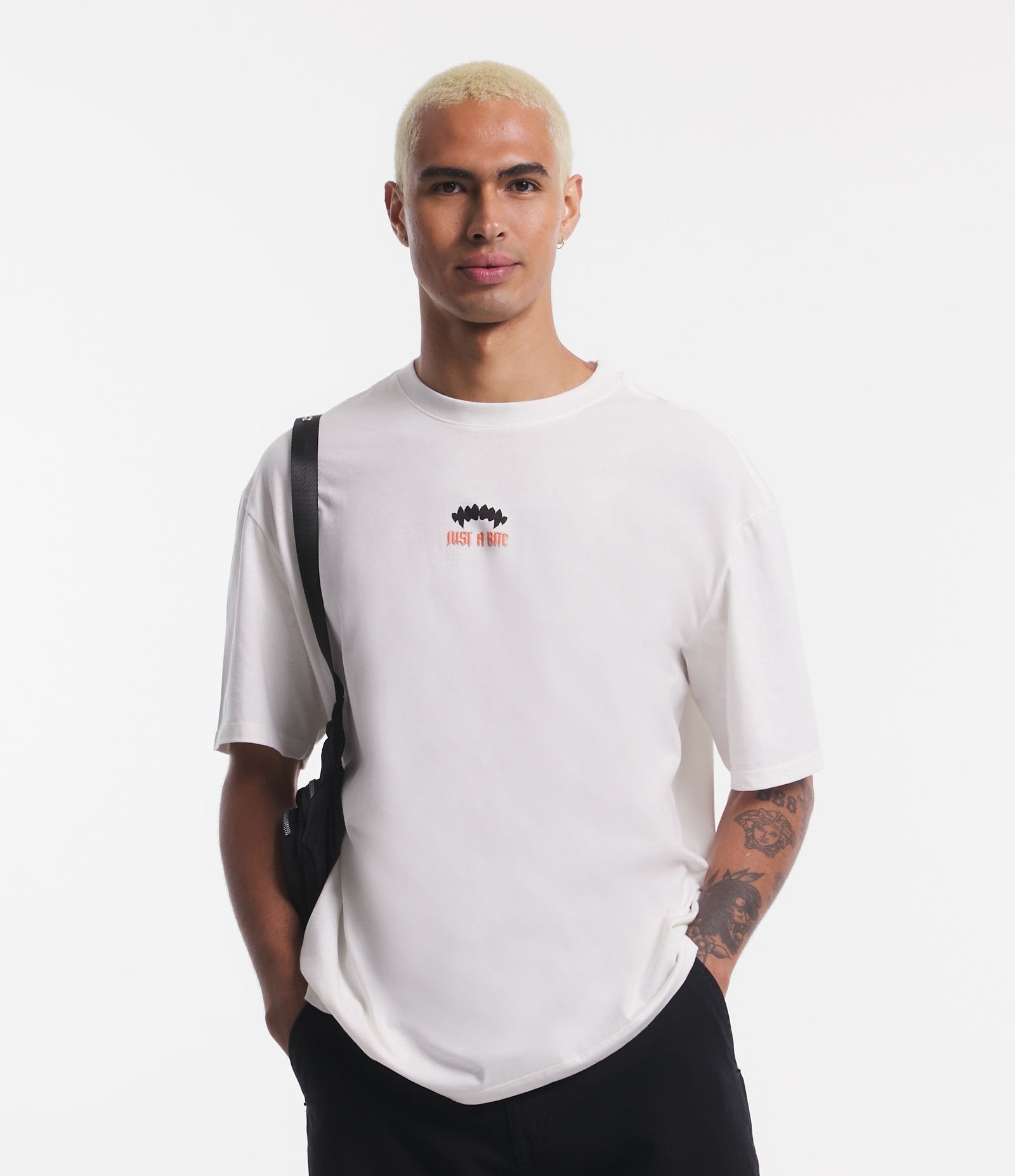Maglietta a maniche corte dal taglio rilassato con stampa di pipistrelli e "Just a Bite" in bianco sporco