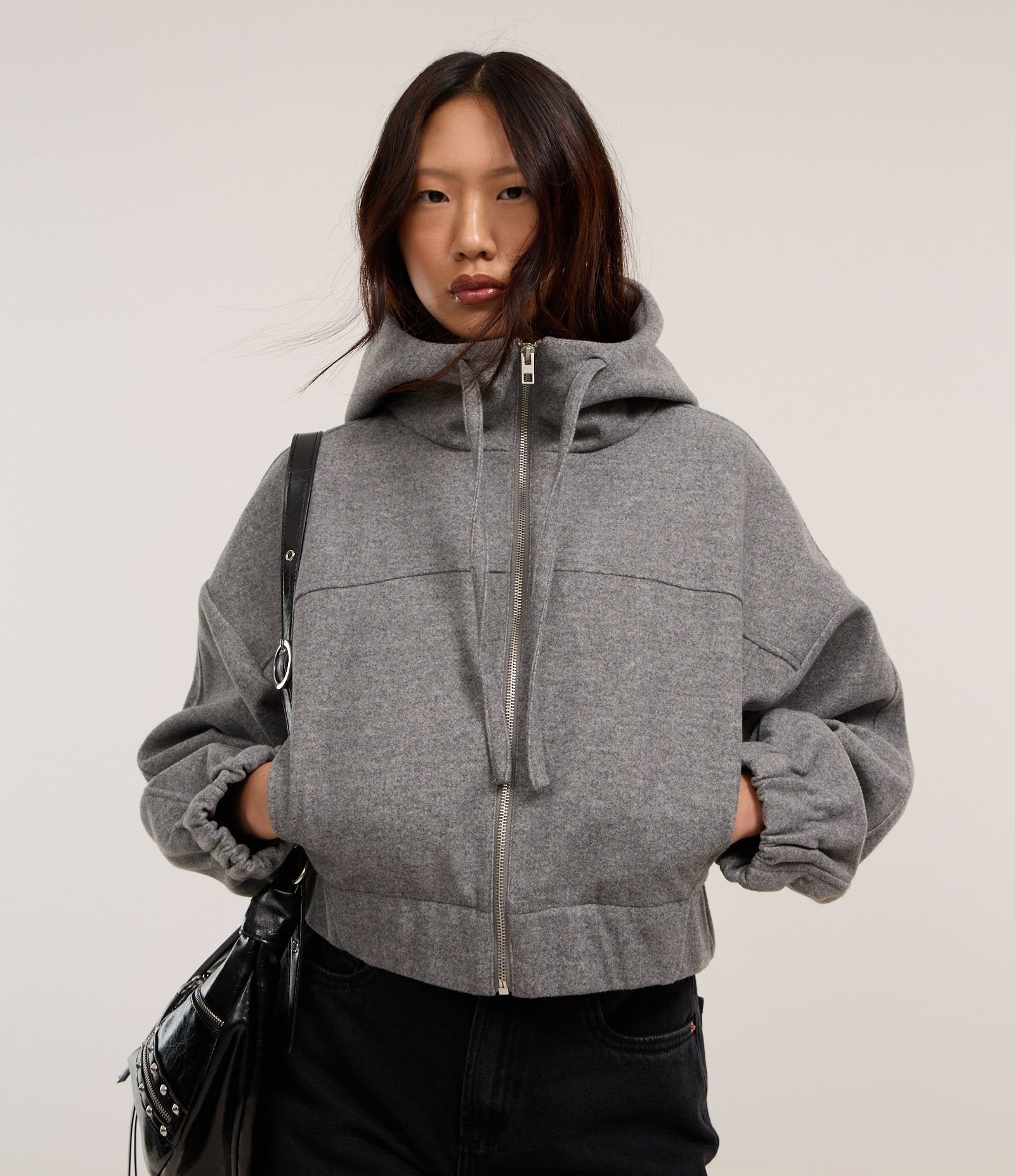 Giacca corta grigia in Polivelour con cappuccio