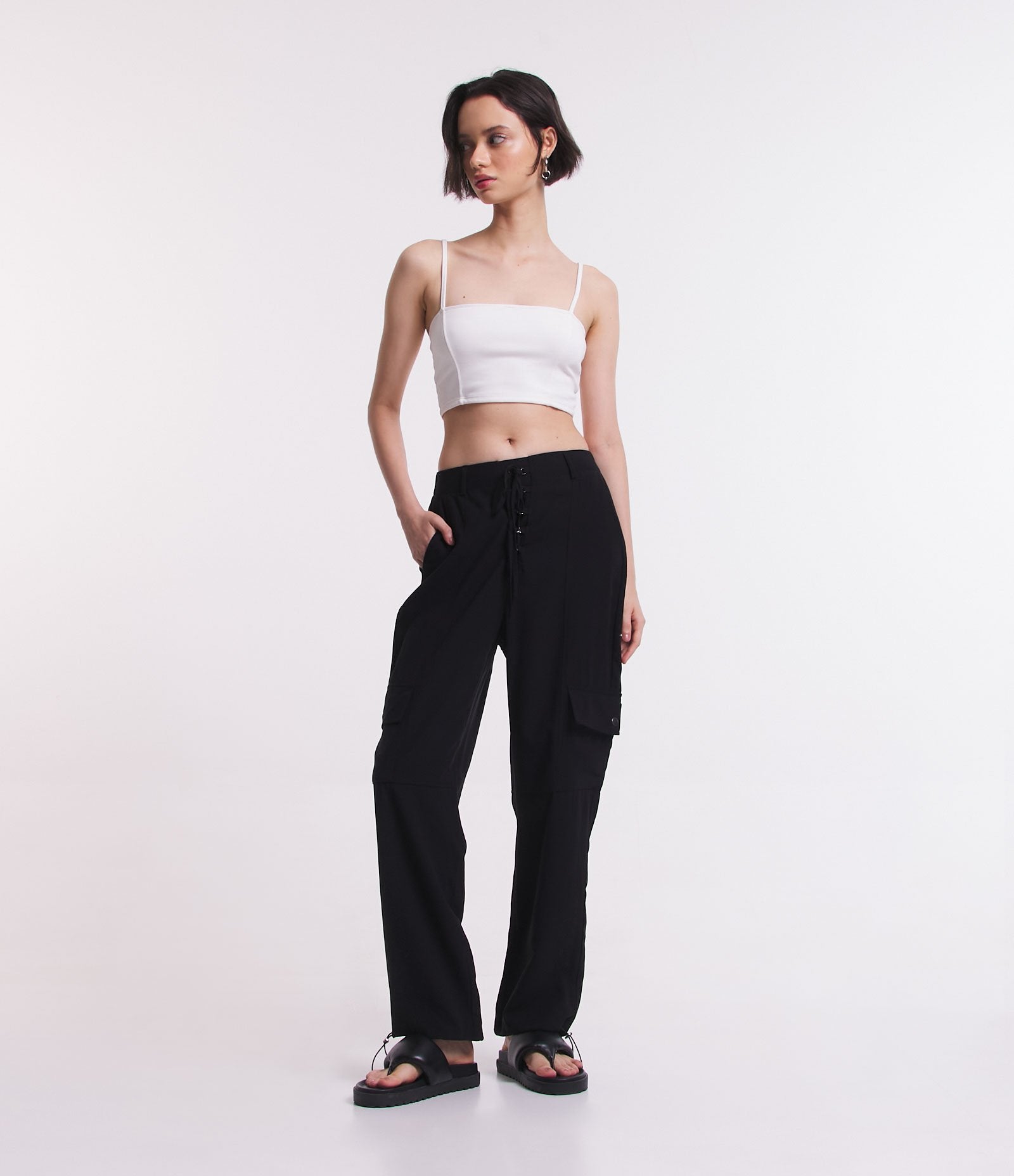 Pantaloni Cargo in viscosa nera con orlo regolabile e vita a cravatta di Renner - Prova il perfetto mix di comfort, qualità e stile in ogni capo.