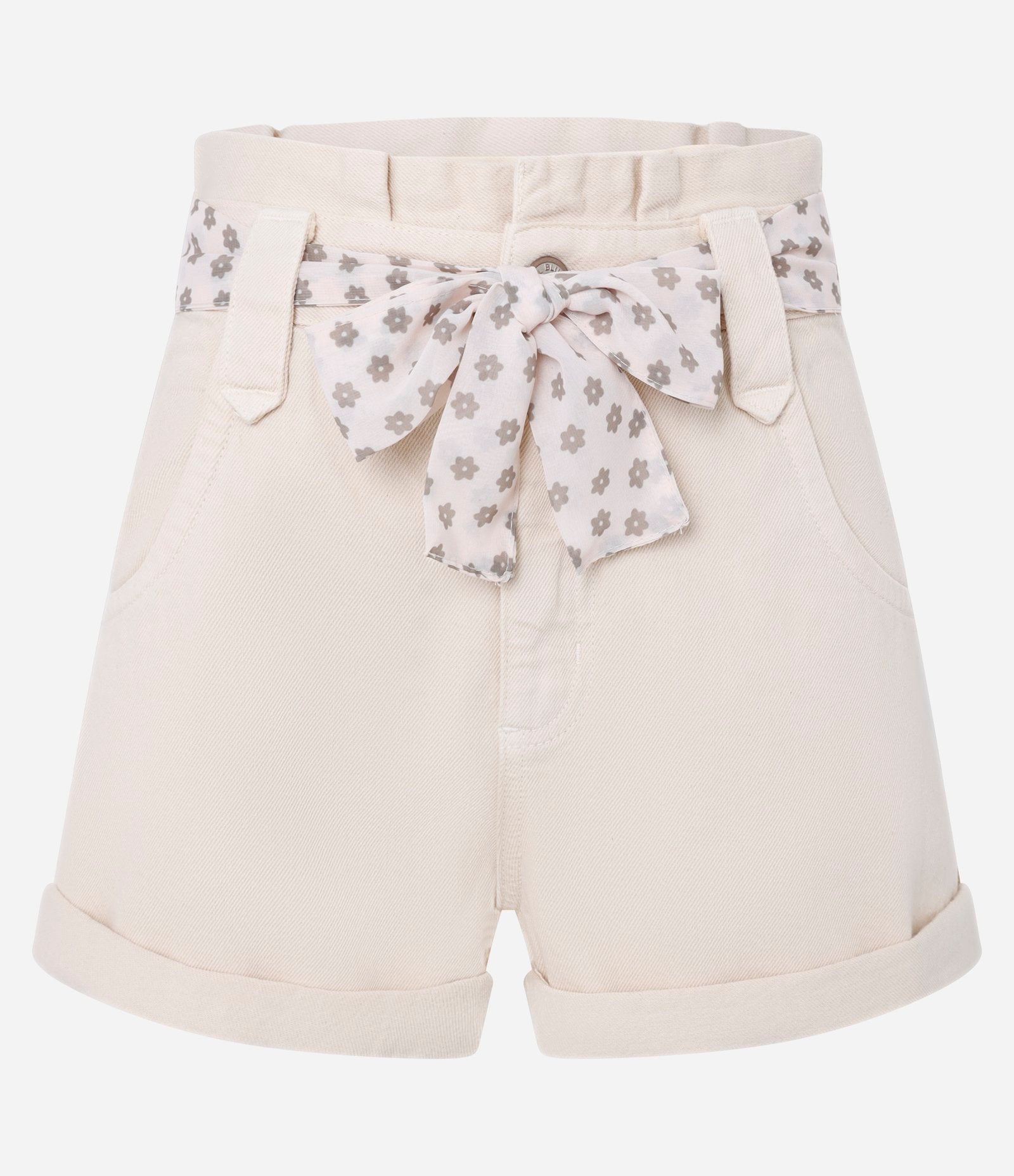 Pantaloncini da mamma in twill beige con cintura a sciarpa e orlo arrotolato
