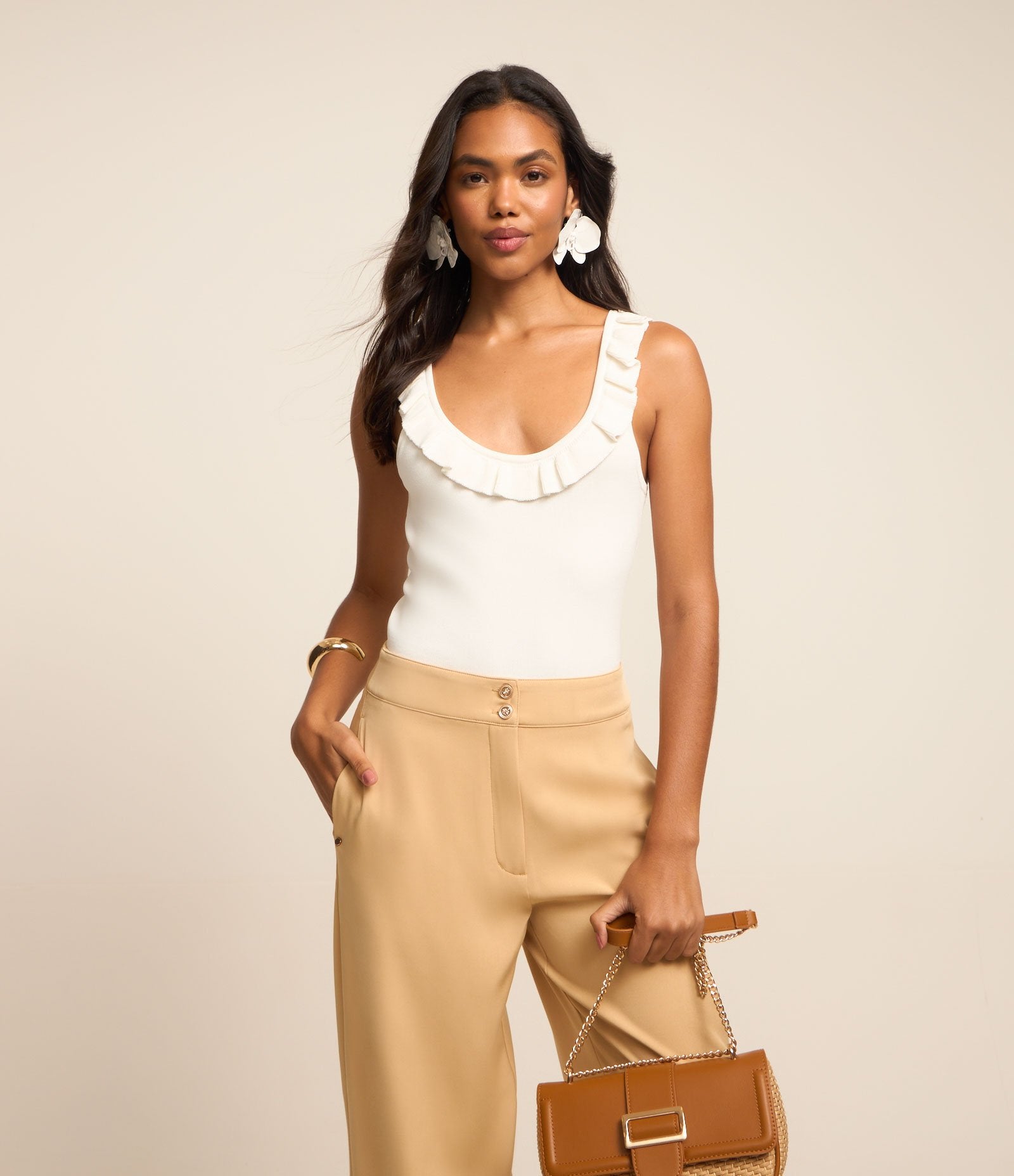 Body senza maniche in maglia a coste con volant bianco di Renner - Prova un comfort senza pari, una qualità eccezionale e uno stile chic in ogni capo.
