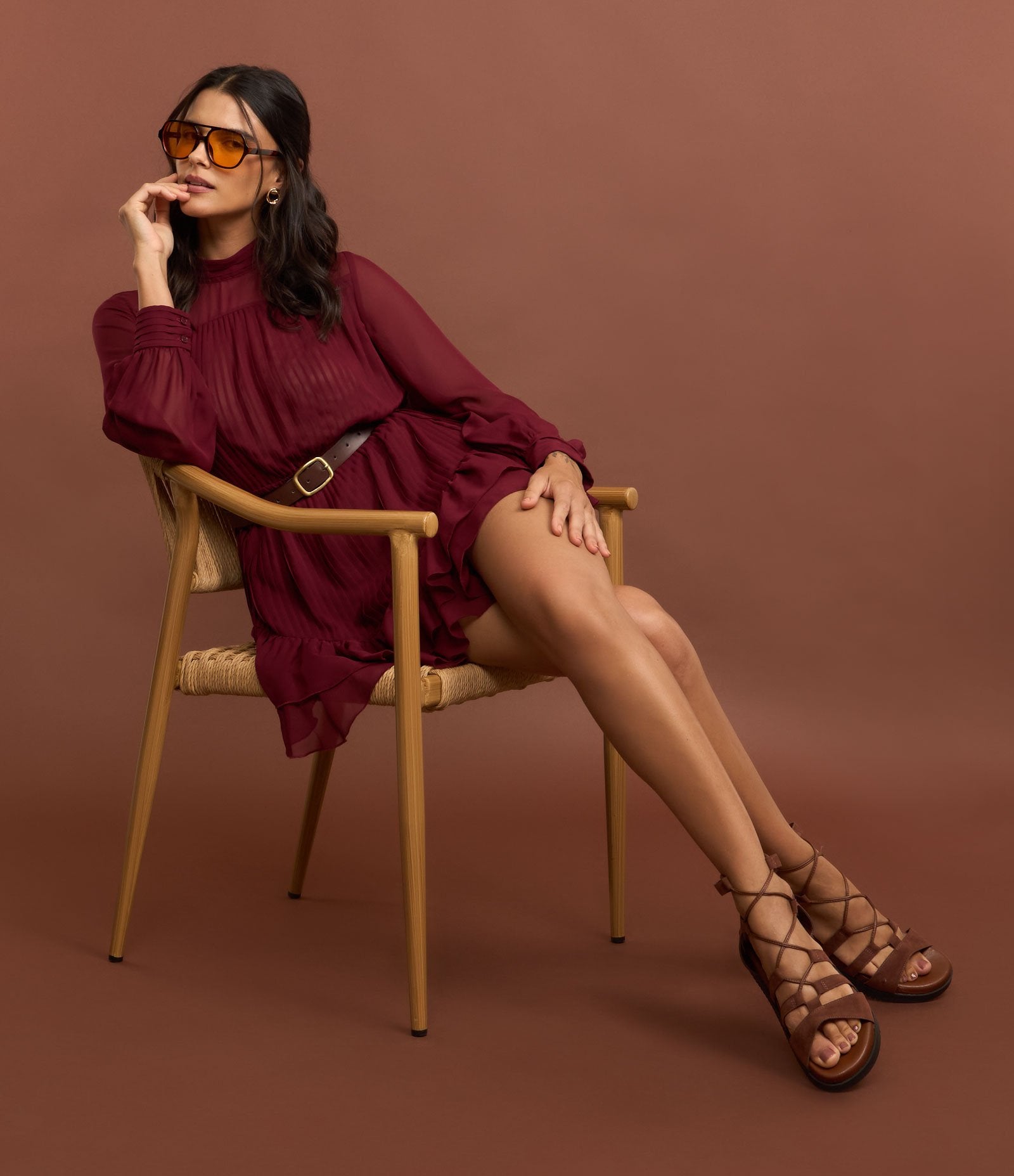 Romper in chiffon plissettato con orlo increspato in borgogna
