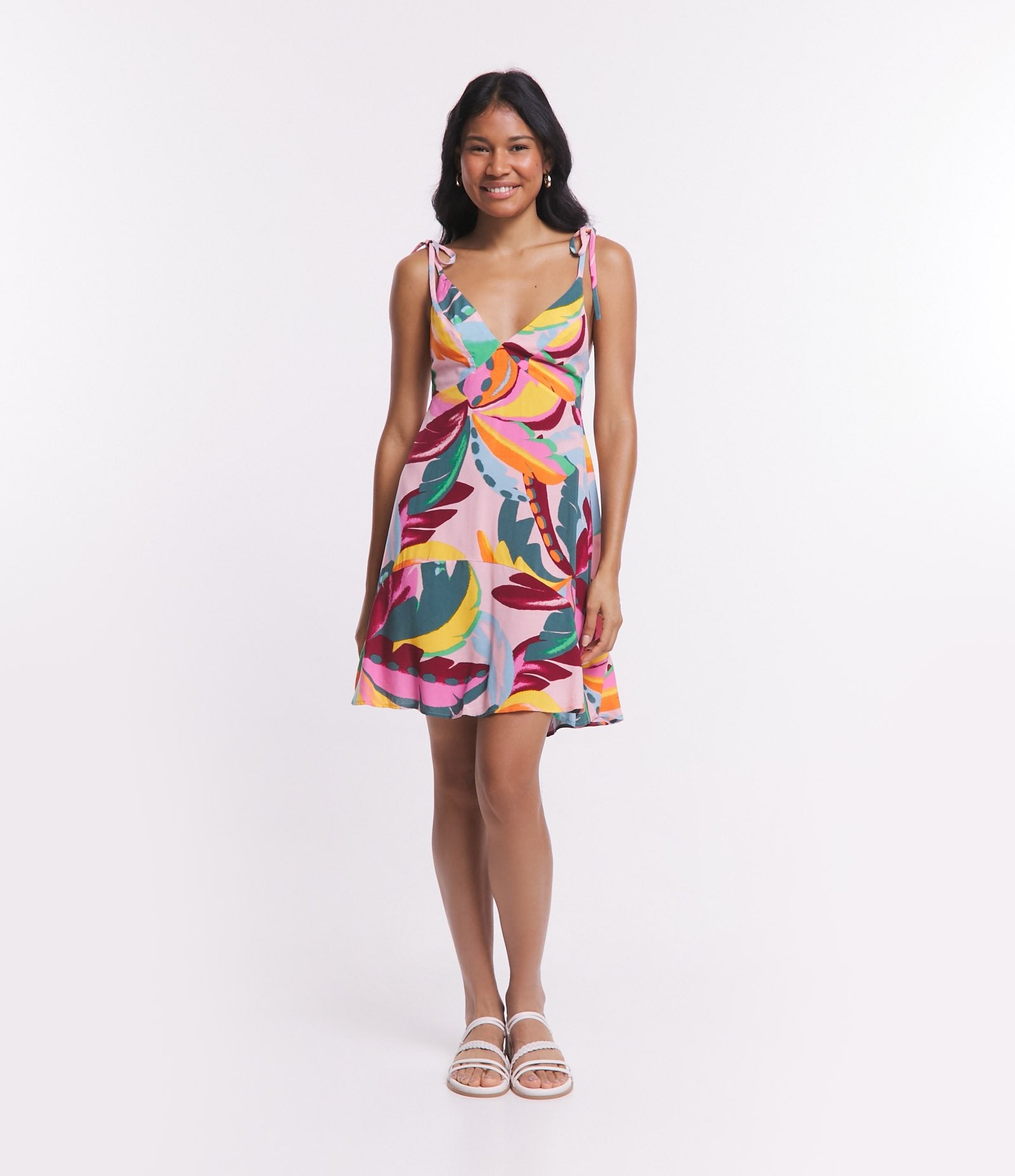 Vestito corto in viscosa con spalline a fiocco e stampa a foglie rosa