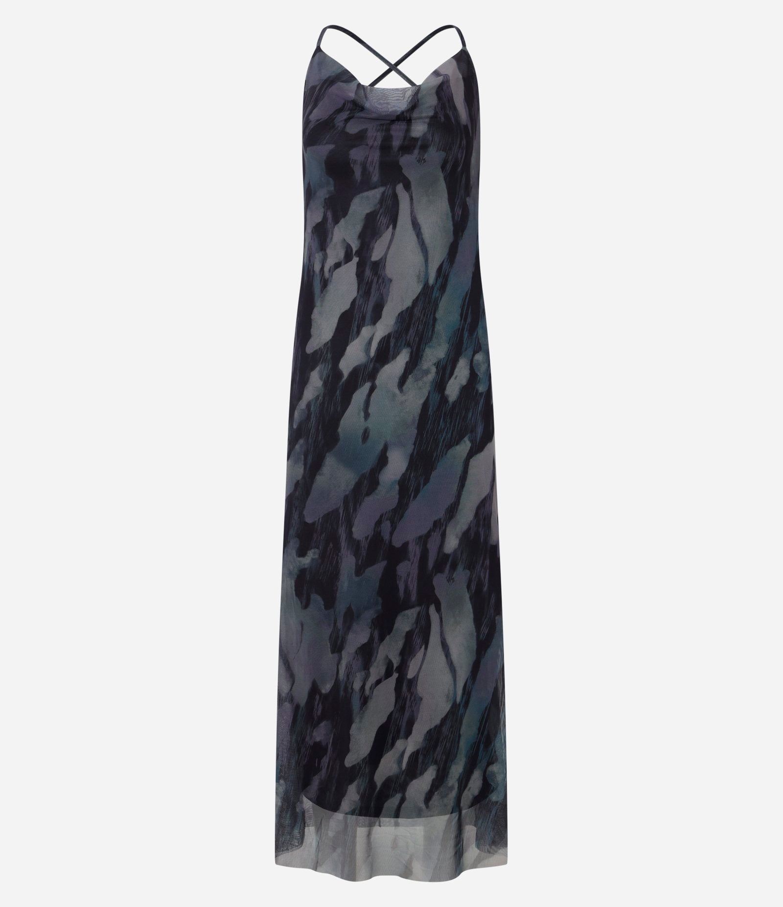 Abito lungo in tulle con scollo drappeggiato e stampa astratta nera di Renner - Prova il comfort, la qualità e lo stile in ogni capo.