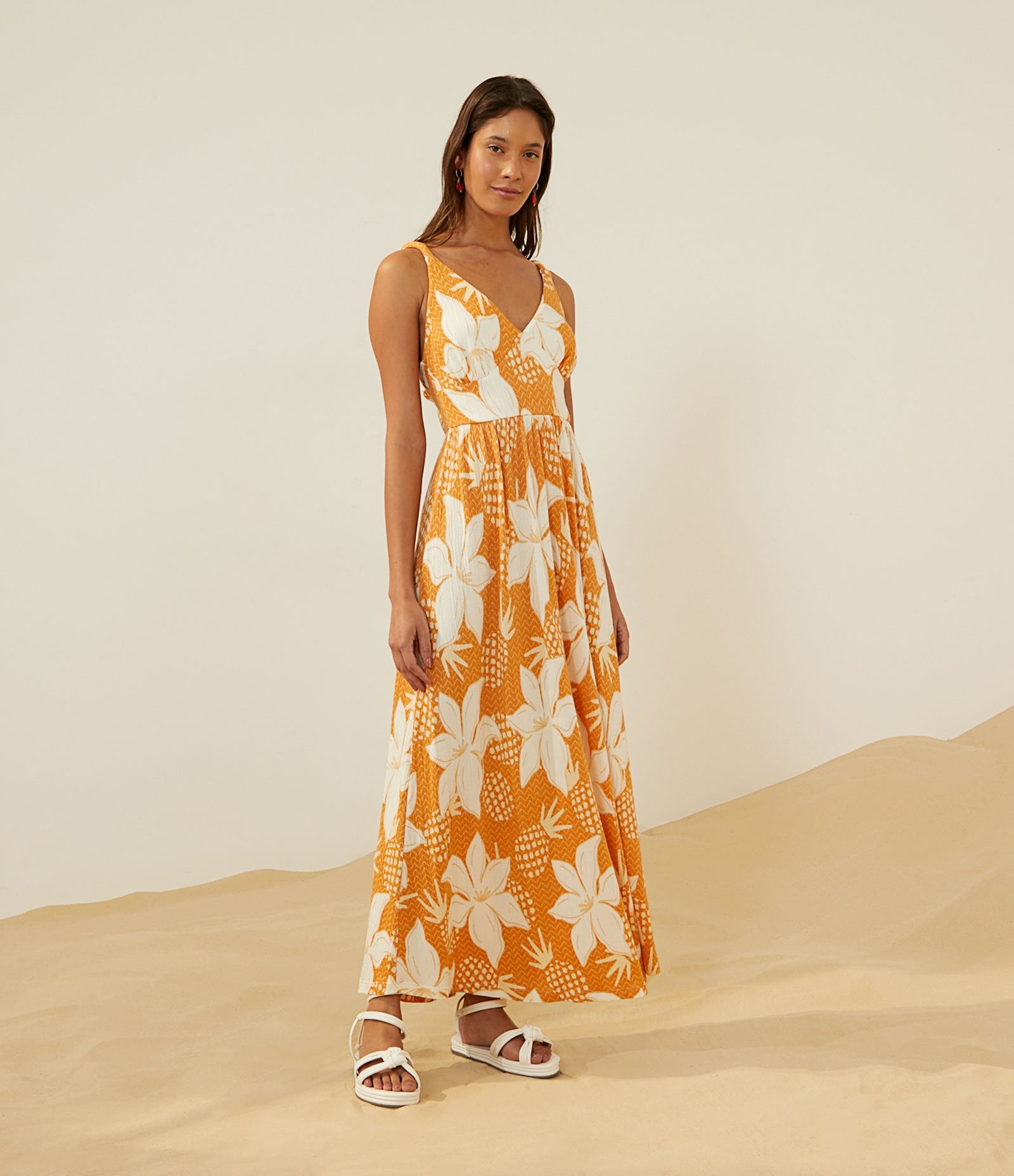 Abito lungo in viscosa con stampa floreale e spalline intrecciate in arancione di Renner - Scopri il mix perfetto di comfort, qualità e stile in ogni capo.