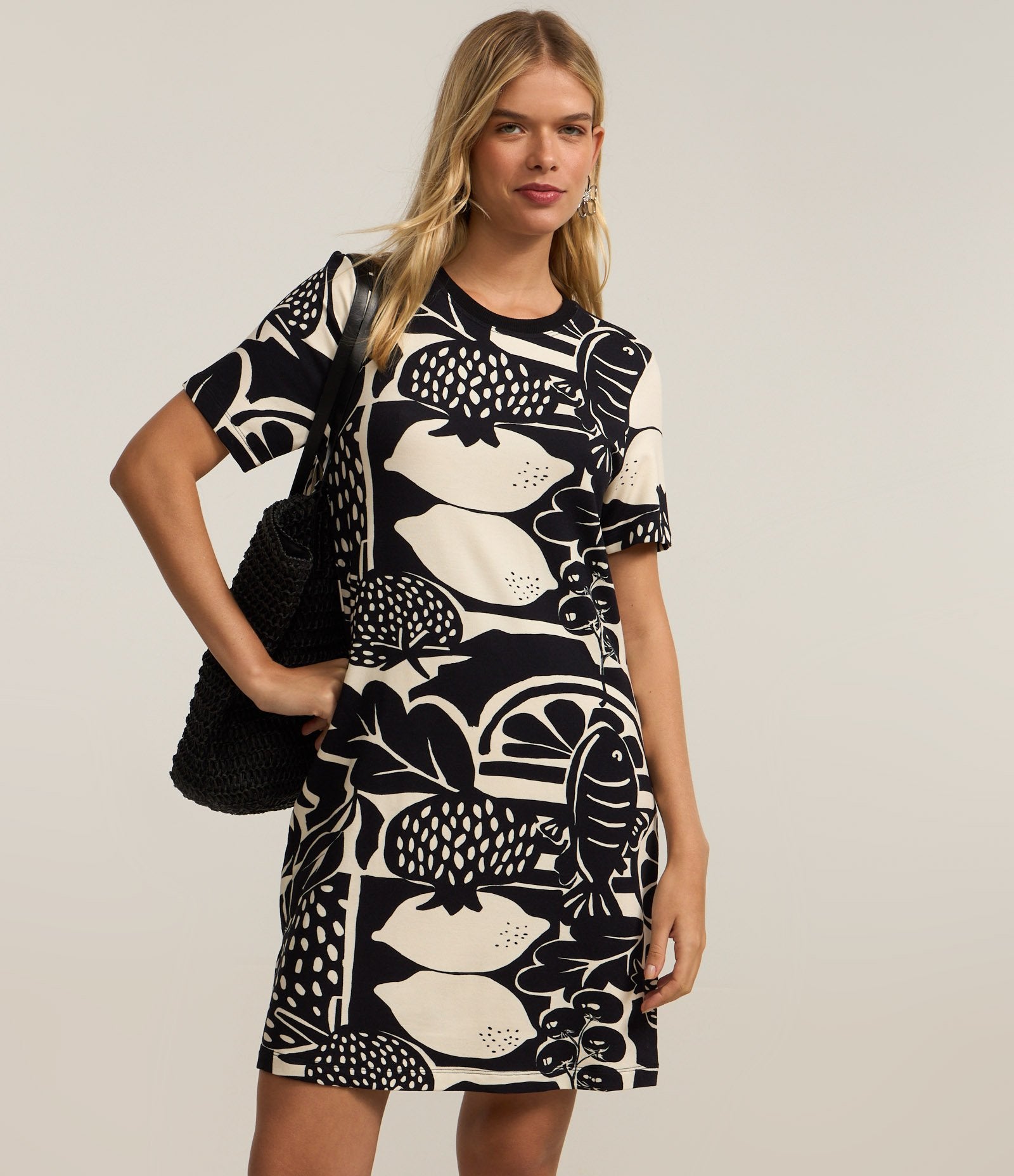 Vestito corto e dritto in viscosa con stampa frutta nero/bianco