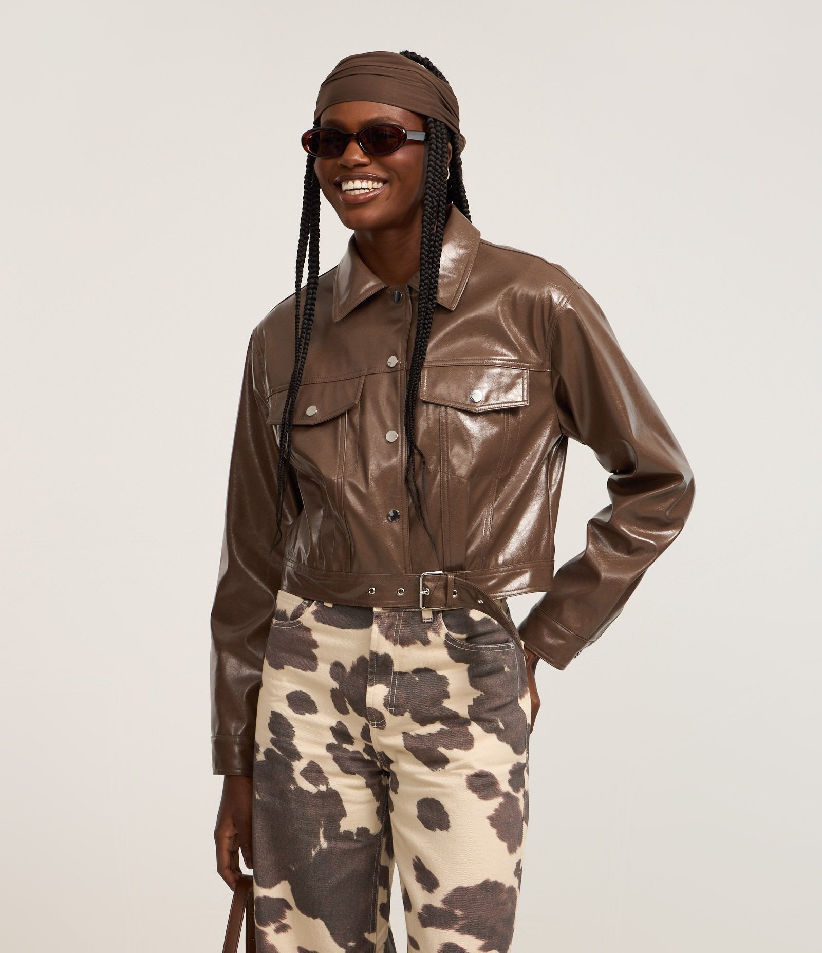 Giacca Trucker marrone in PU con tasche e fibbia sul fondo