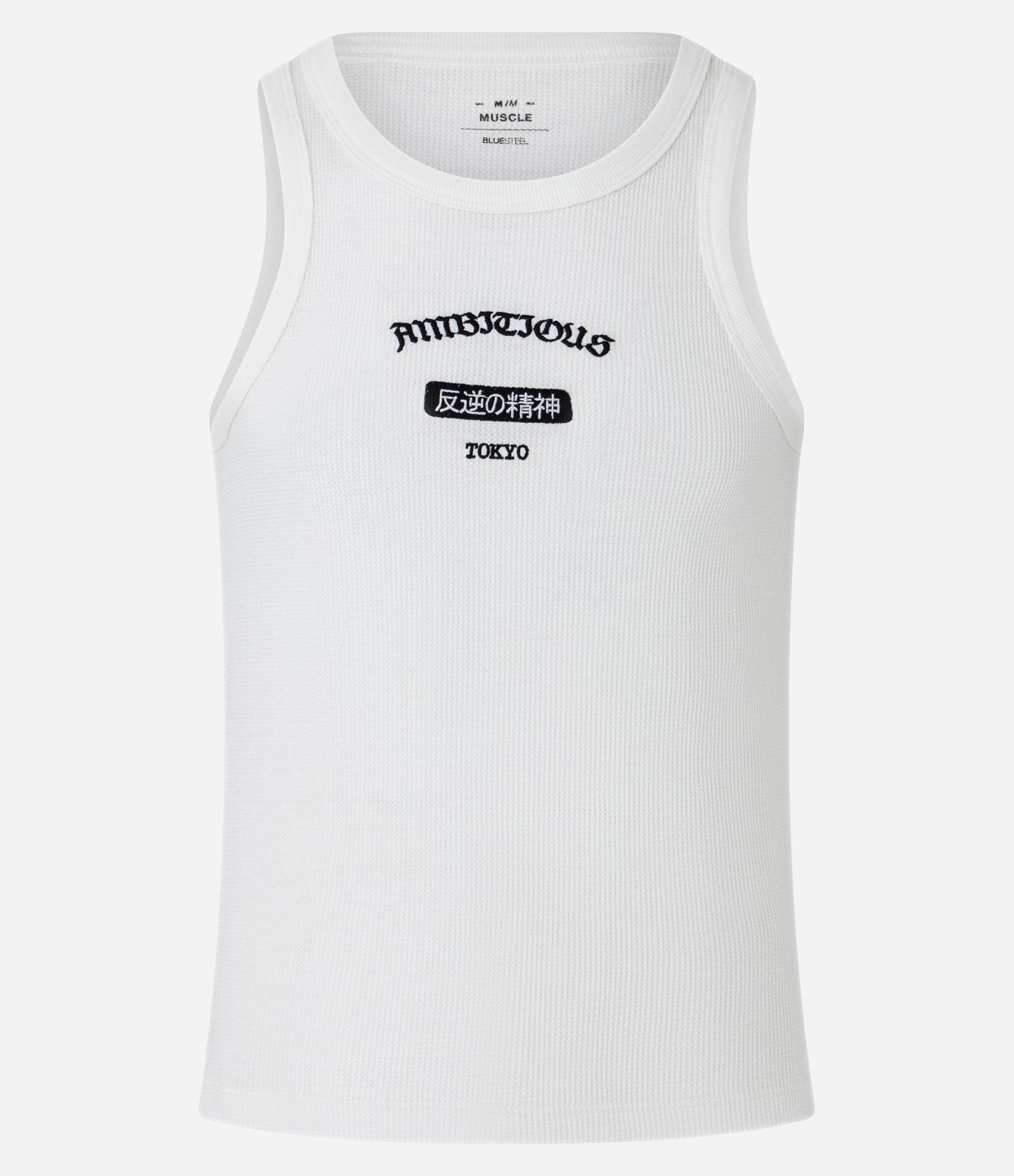 Camicia muscolare senza maniche in cotone con ricamo a lettere bianche