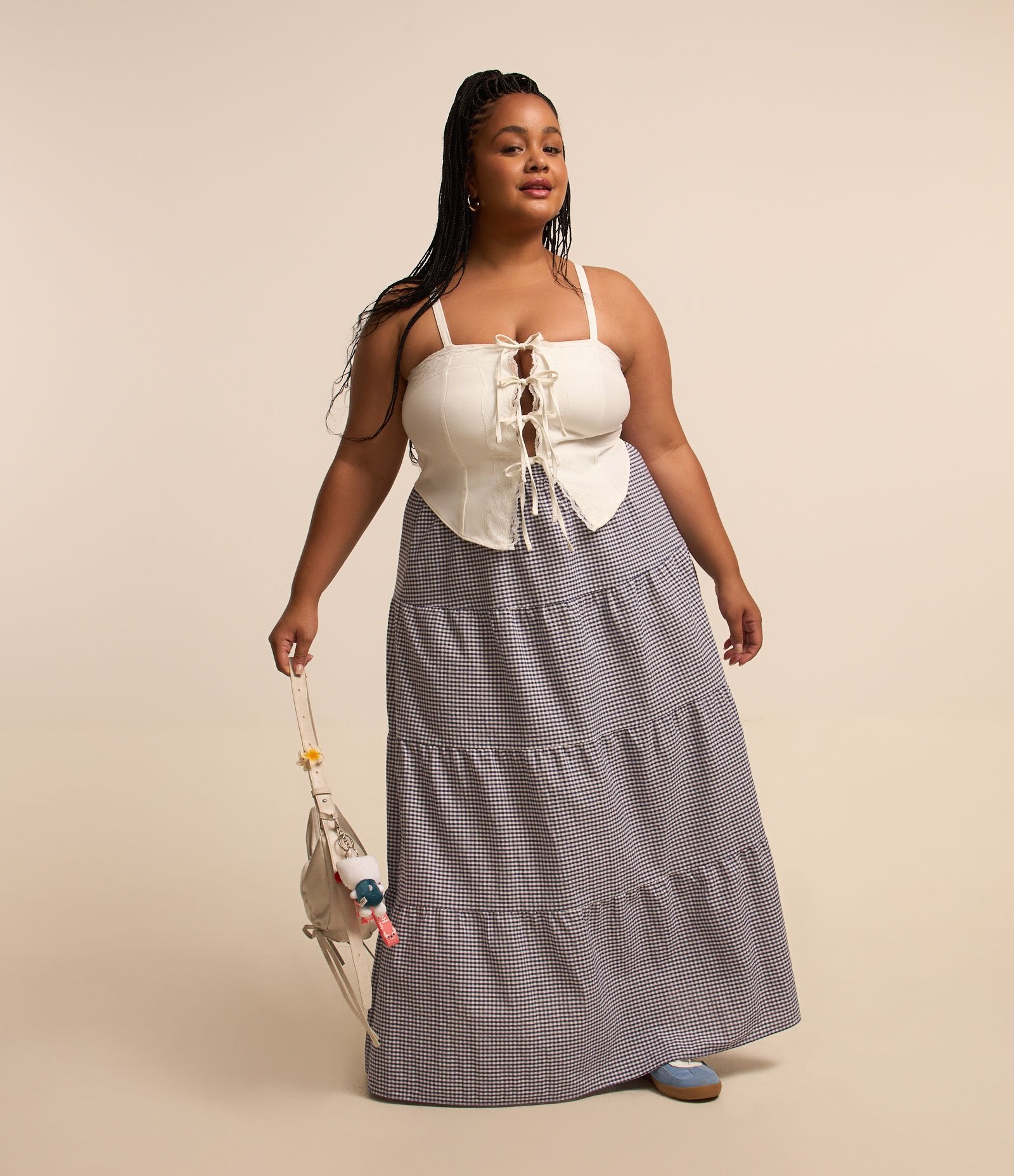 La gonna lunga in Ana Ruga Vichy Check Curve & Plus Size in bianco/blu di Ashua Curve è realizzata per abbracciare e valorizzare le tue curve con stile e sicurezza. Ideale per ogni occasione, questo capo combina perfettamente comfort ed eleganza in un design lusinghiero.