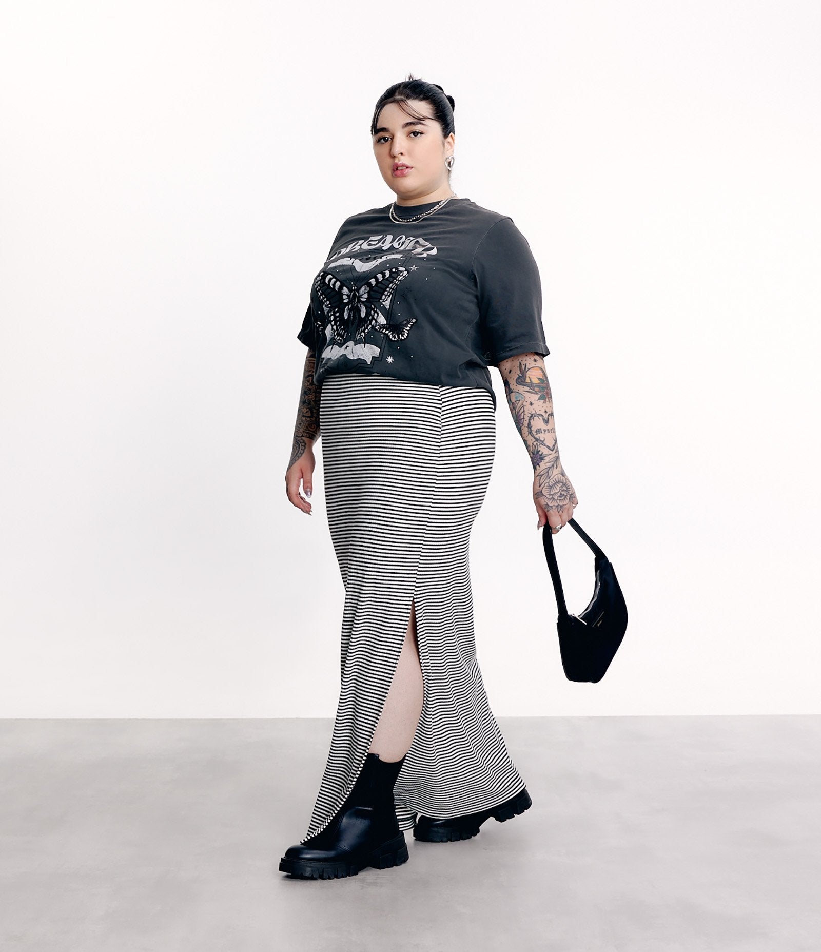 Maxi gonna a righe a coste con spacchi laterali, taglie forti e taglie forti, nero/bianco